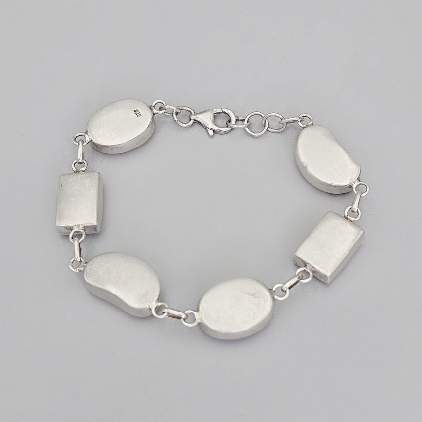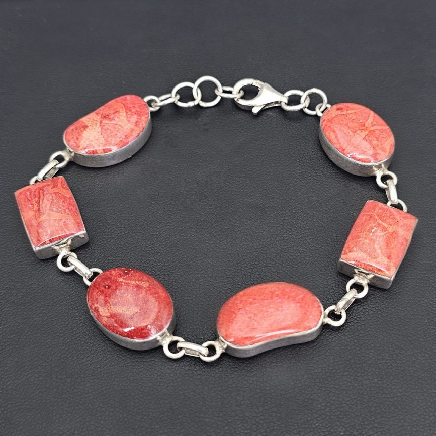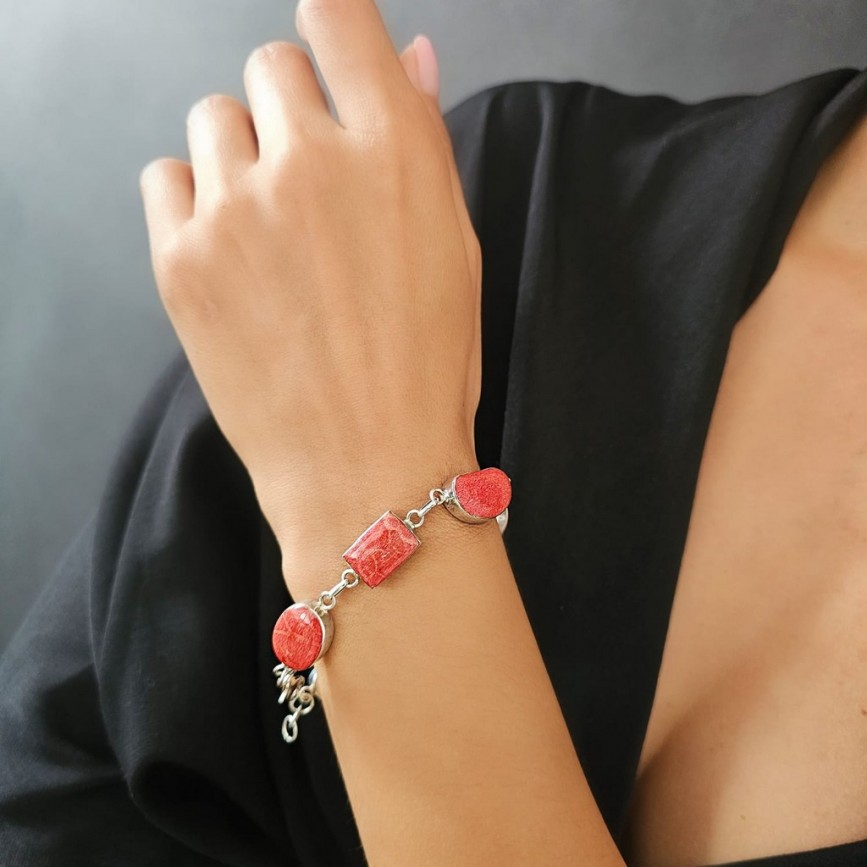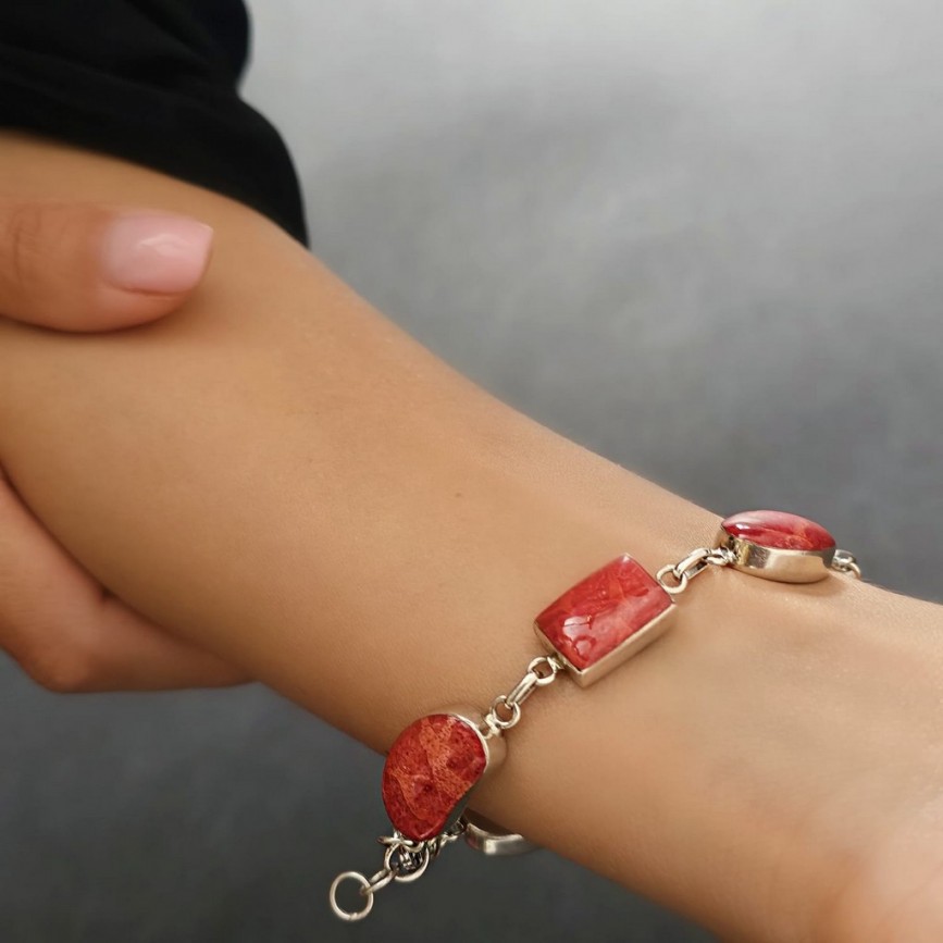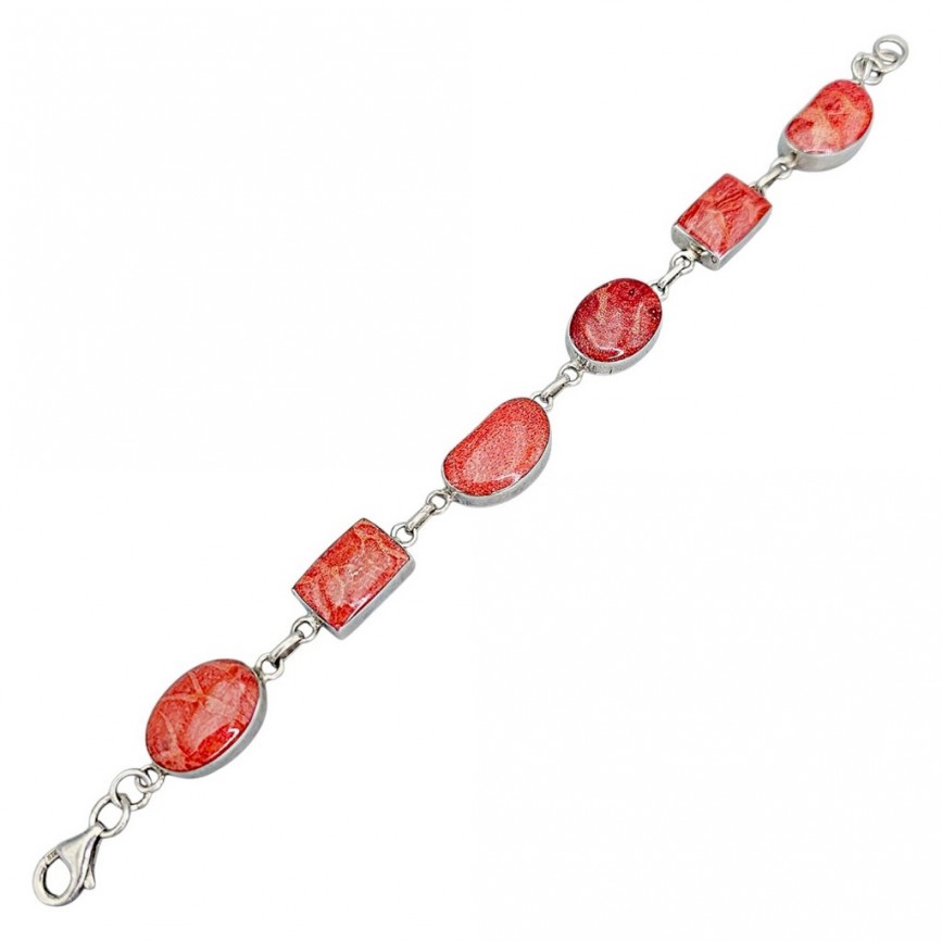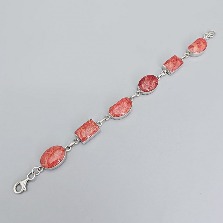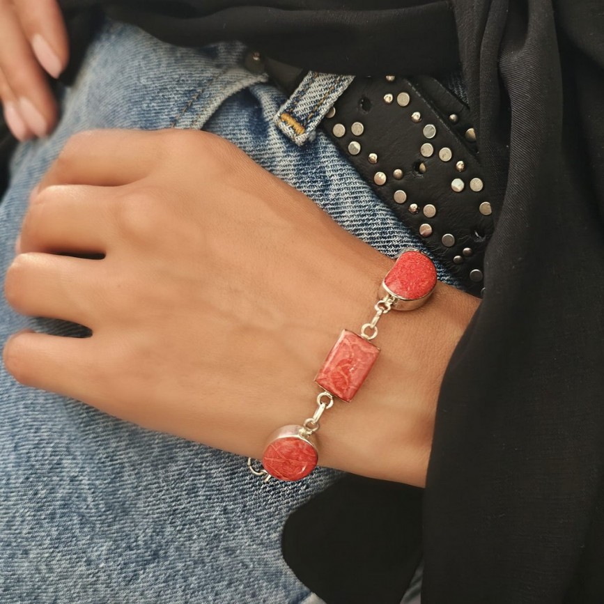 Brățara este alcătuită din 5 elemente cabochonizate, montate în casete atent geometrizate, ce lasă în prim-plan frumusețea organică a coralului.
