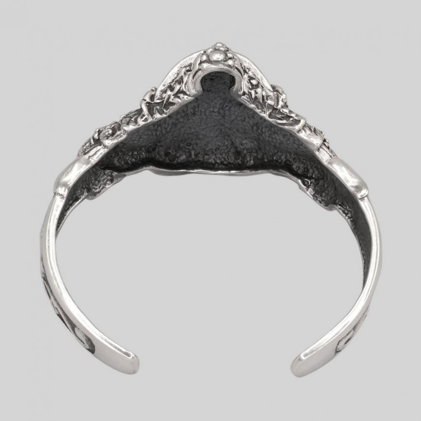această brățară statement se impune prin forță vizuală, simbolism intens și o execuție sculpturală de impact.