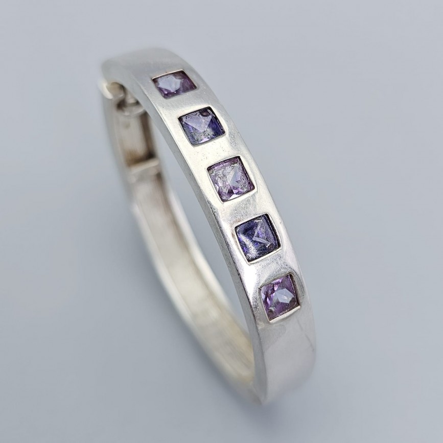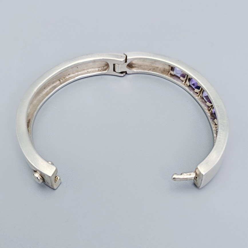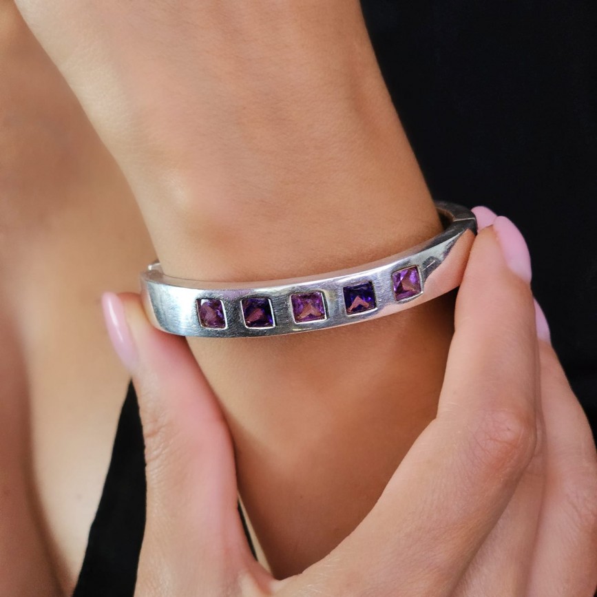 Brățară bangle modernistă de perioadă mid-century, din argint masiv decorată cu ametiste naturale.