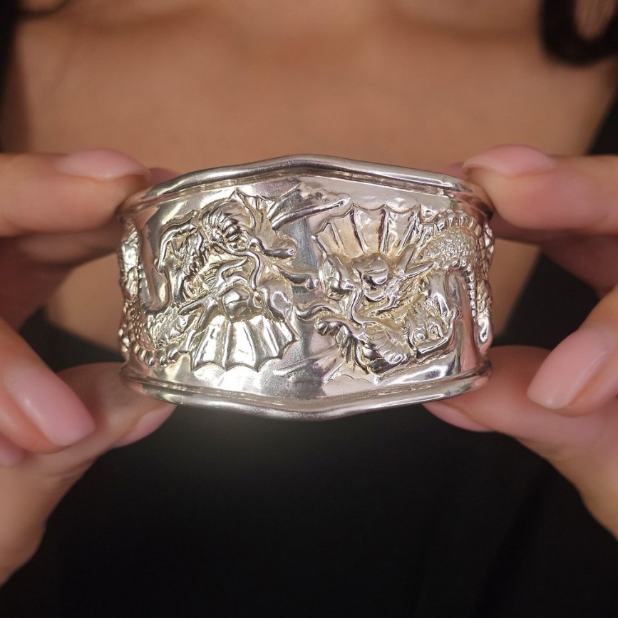 Brățară statement ornamentată în relief prin tehnica au-repoussé cu doi dragoni afrontați,