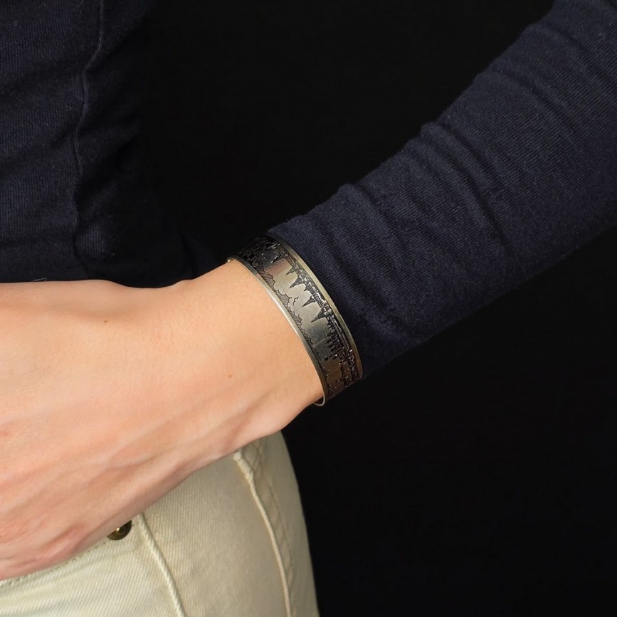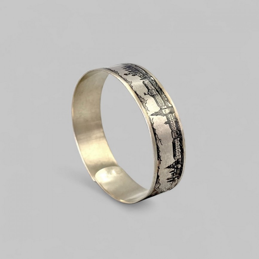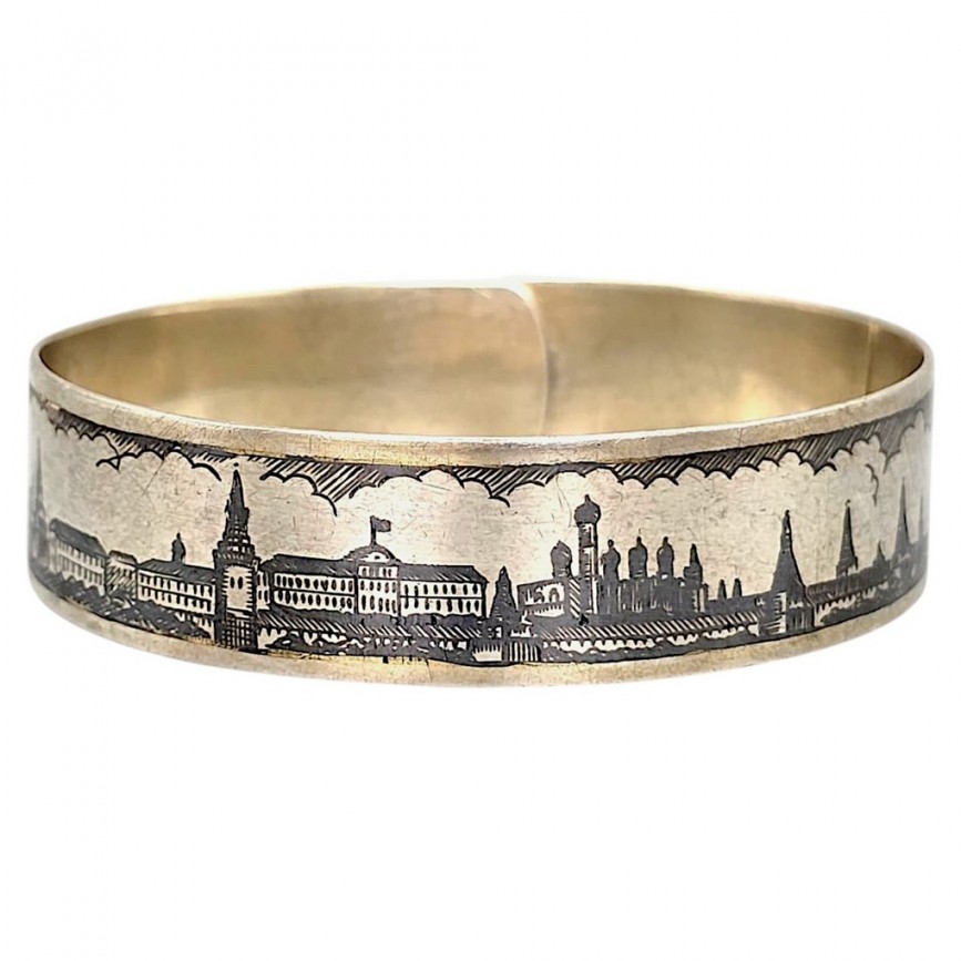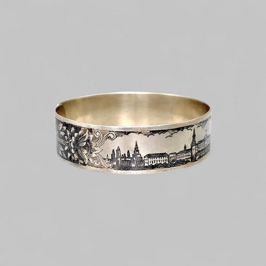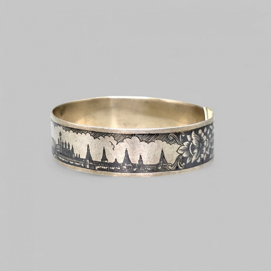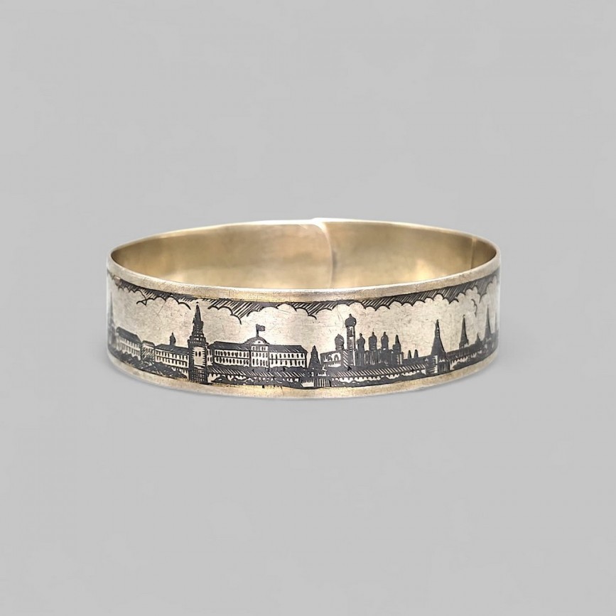 Brățară cuff manufacturată în argint aurit, decorată în tehnica niello cu vedute ale Kremlinului.