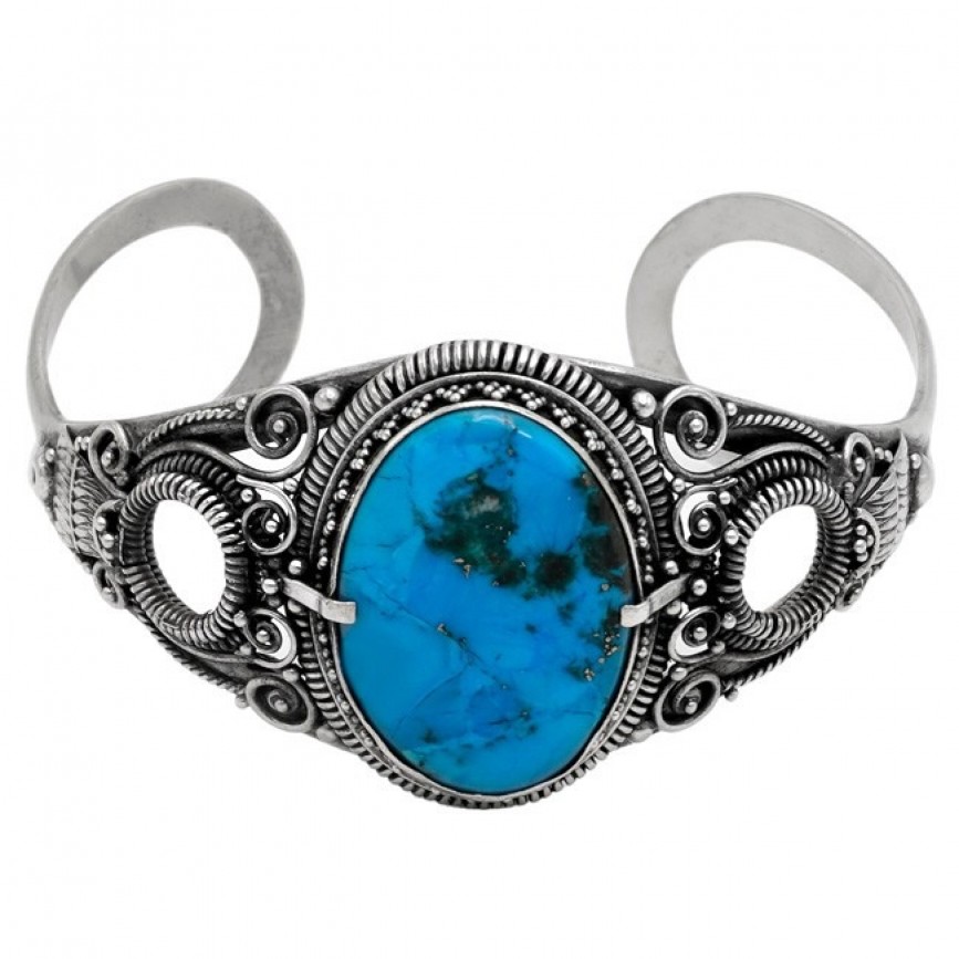 Veche brățară etnică, tip „cuff”, decorată central cu un anturaj remarcabil specimen de turcoaz natural himalayan.