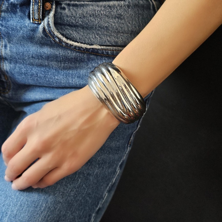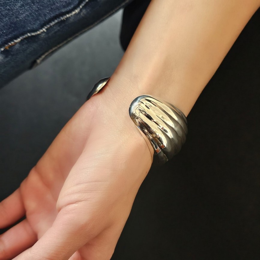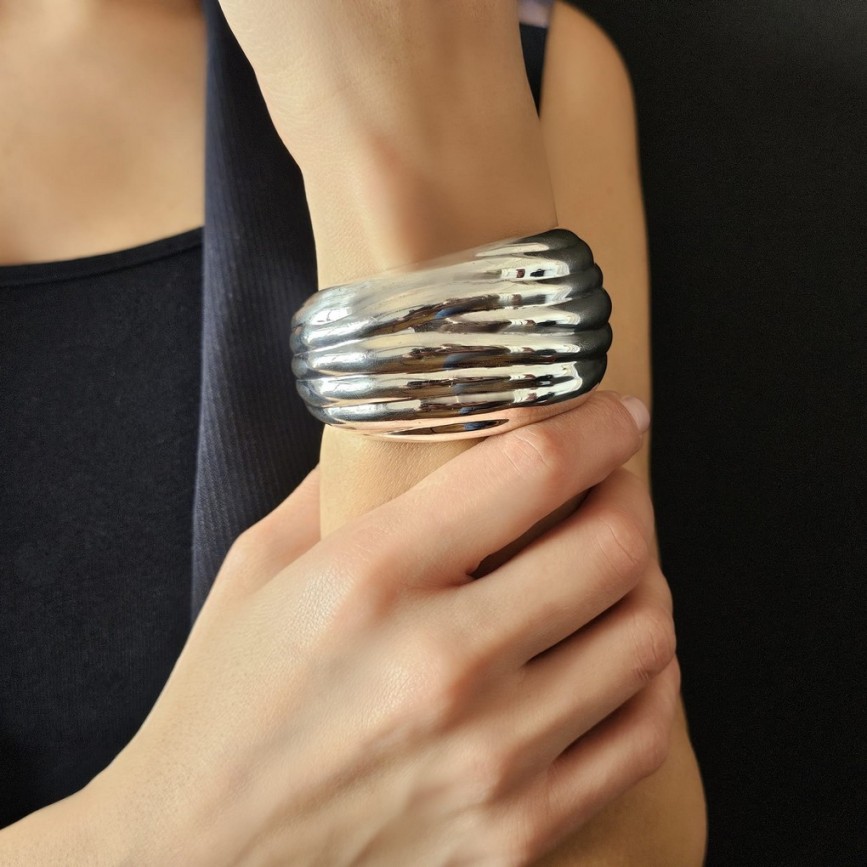 Brățară statement într-un registru retromodernist, definită de linii fluide și caneluri ample ce captează și reflectă lumina într-un joc continuu.