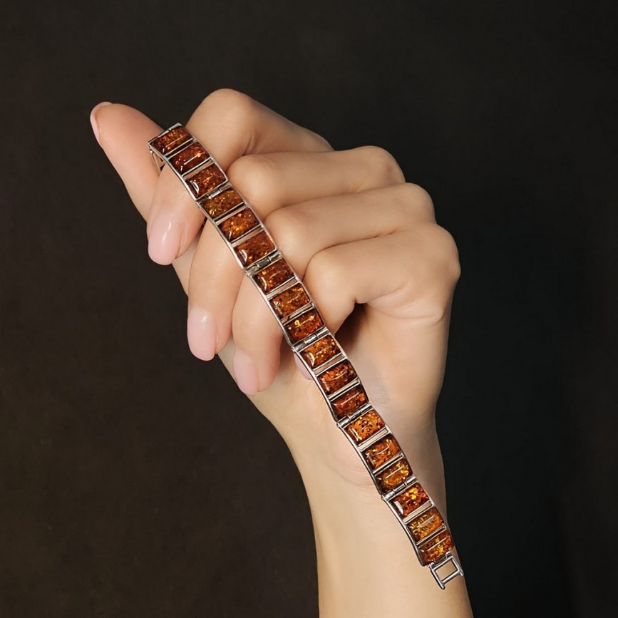 Brățară modernistă din argint decorată cu anturaje de chihlimbar baltic natural.