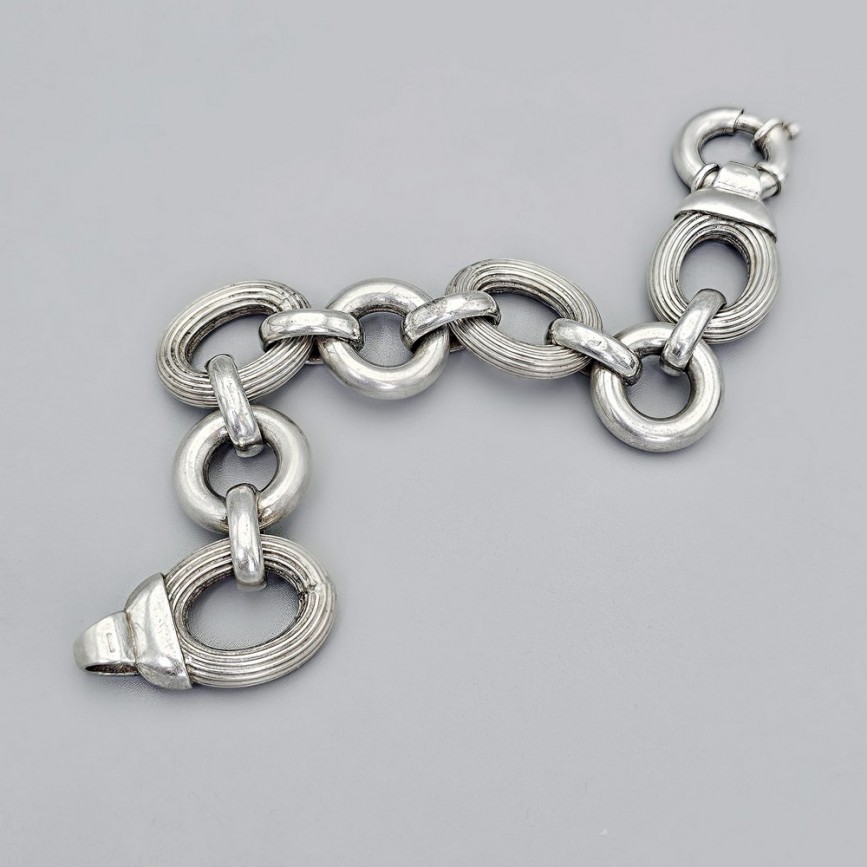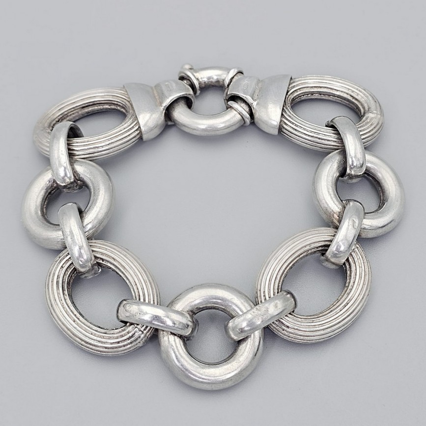 Brățară compusă din verigi ovale și circulare alternante, cu relief ritmic între suprafețele netede și cele fin striate.