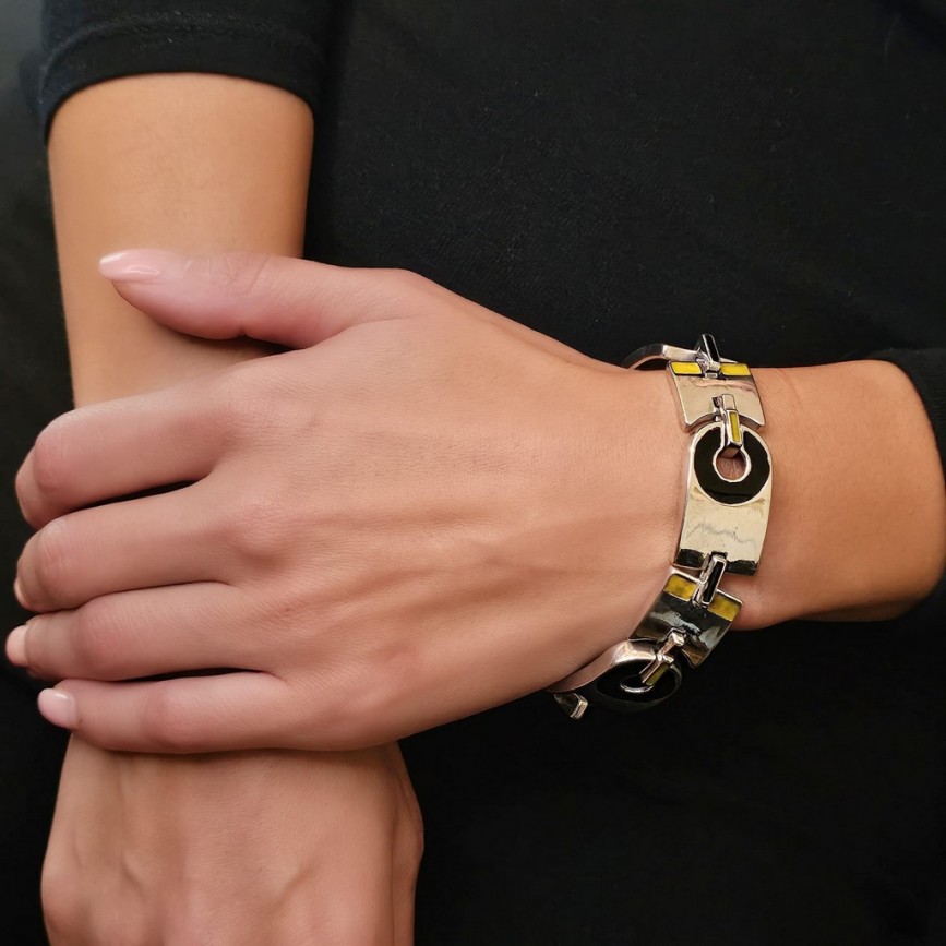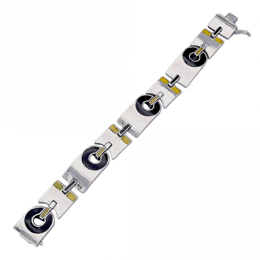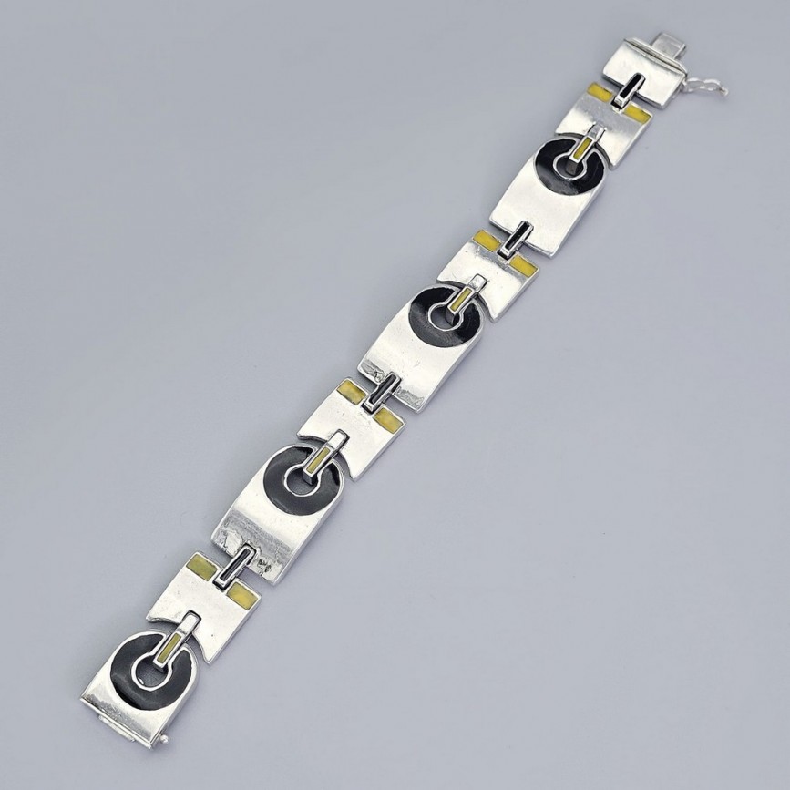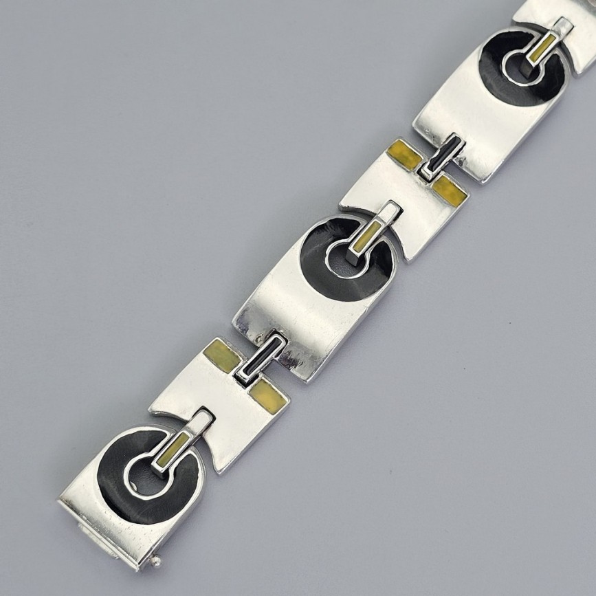 Suprafețe netede de argint lustruit, cu inserții emailate în negru lucios și galben ocru,