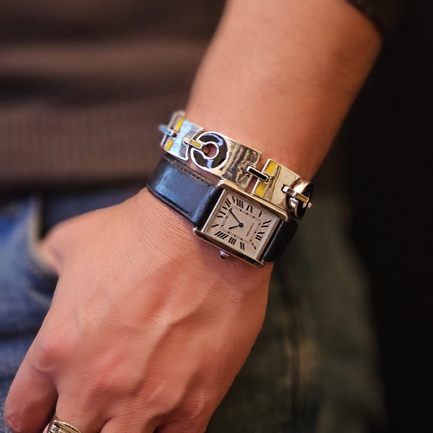 această brățară reunește în mod exemplar rigoarea geometrică a școlii Bauhaus cu eleganța orfevrăriei italiene.