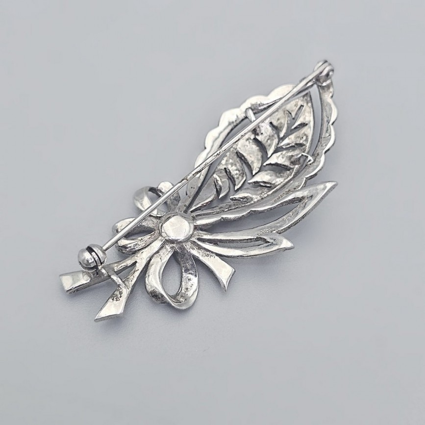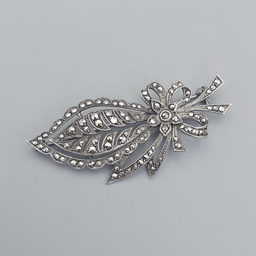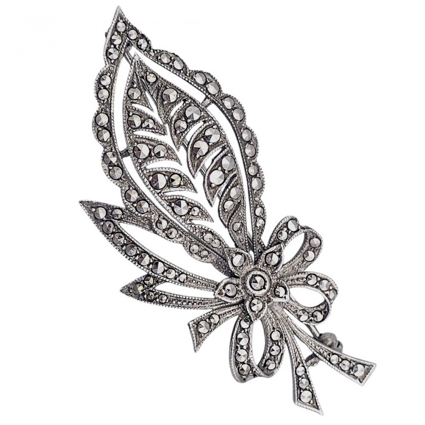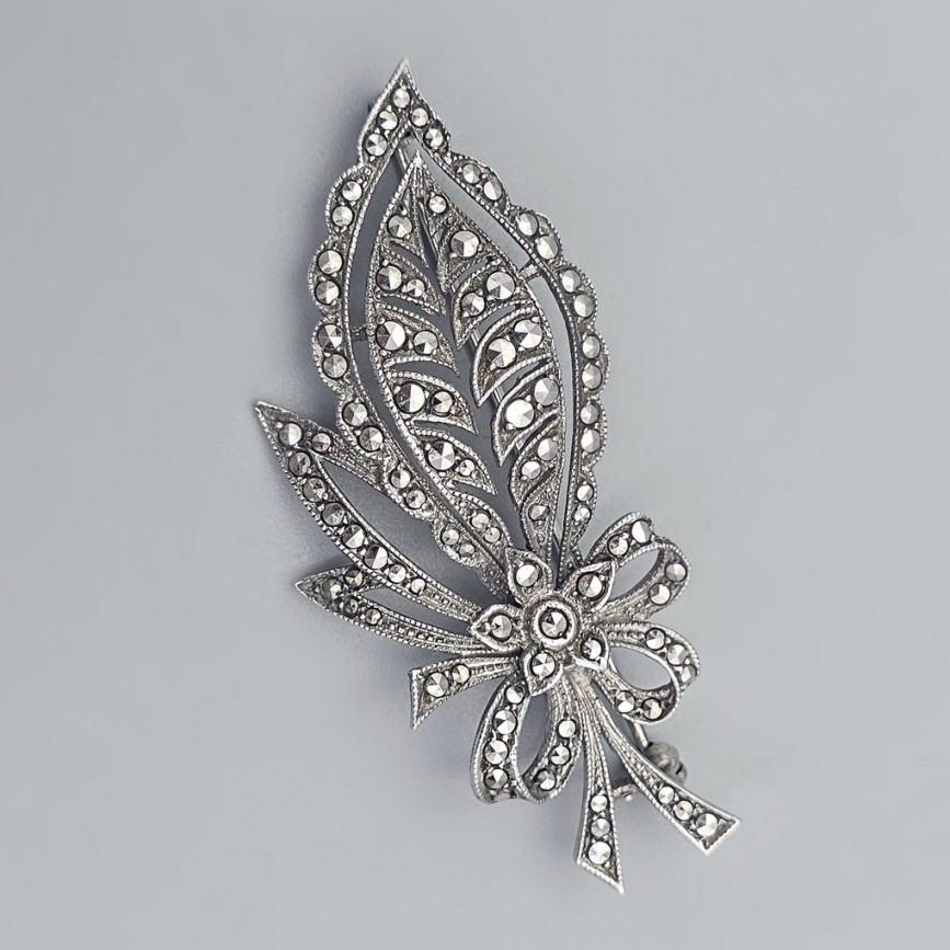 Broșă Art Deco din argint, minuțios decorată cu incrustații de marcasite.