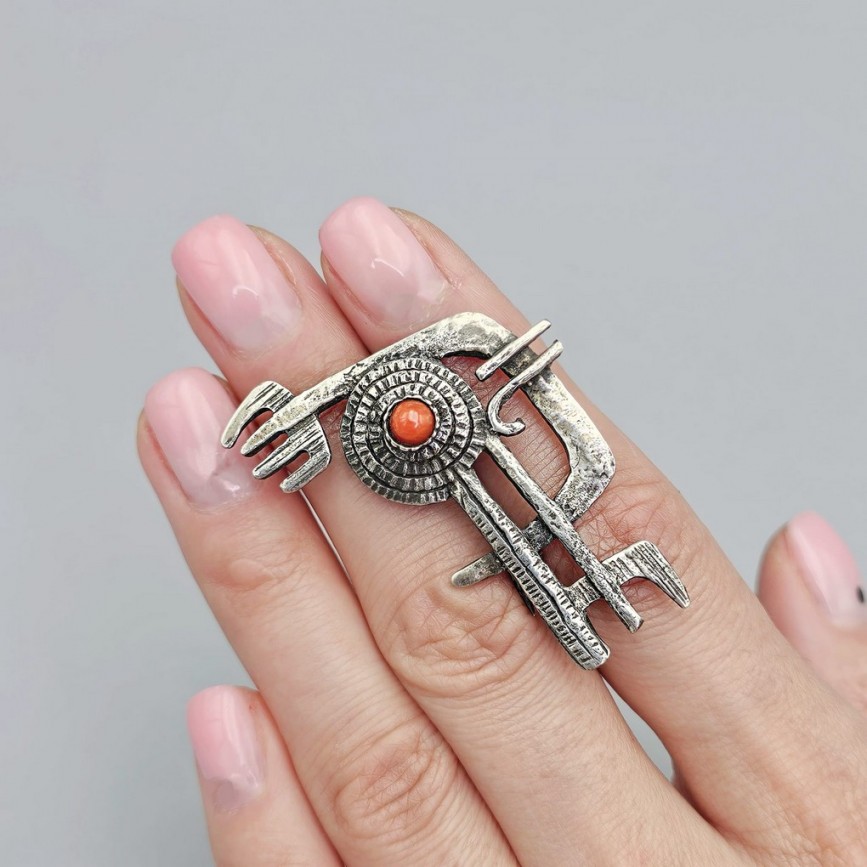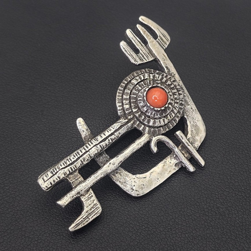 Inedită broșă statement mid-century din argint texturat și coral natural de Sardinia.