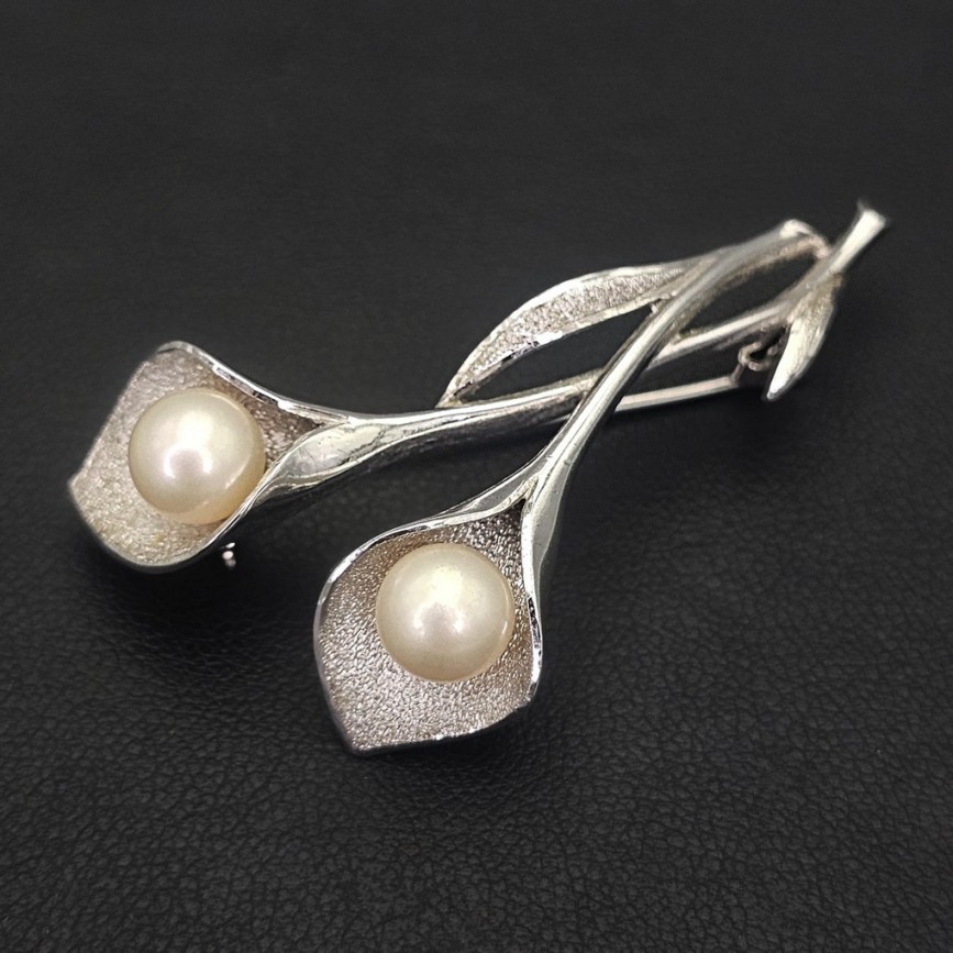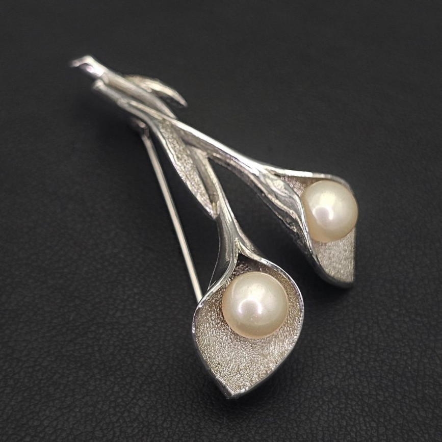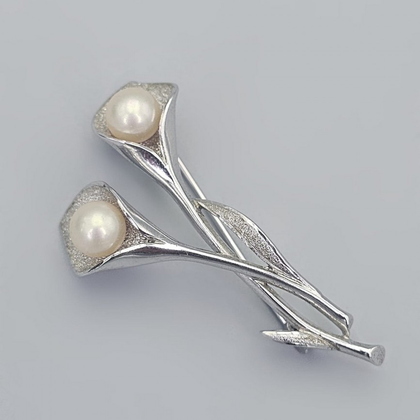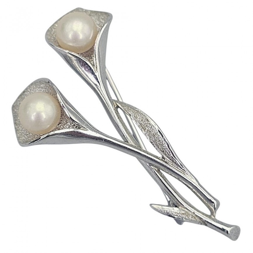 Elegantă broșă modernistă “ Flori de cală “ din argint rodinat cu perle man-made.