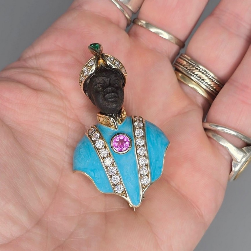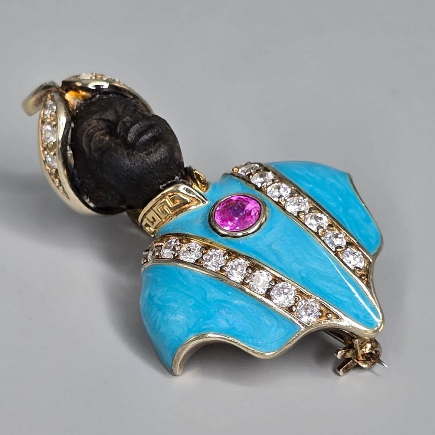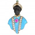 Broșă statement Blackamoor - Moretto Veneziano din argint aurit și emailat cloisonne, decorată cu anturaje de cristale cubic zirconia.