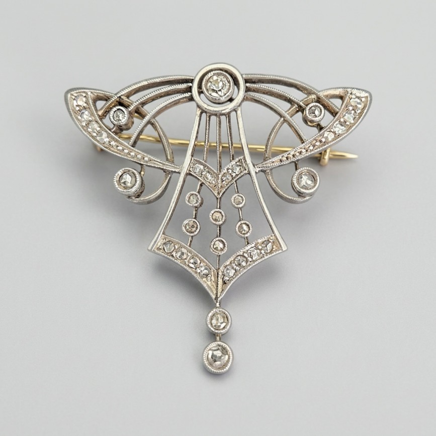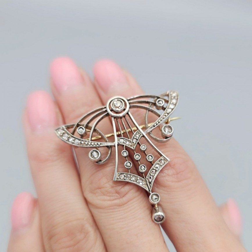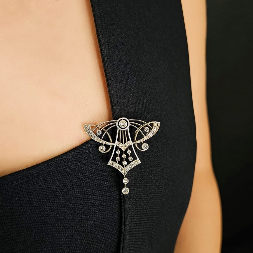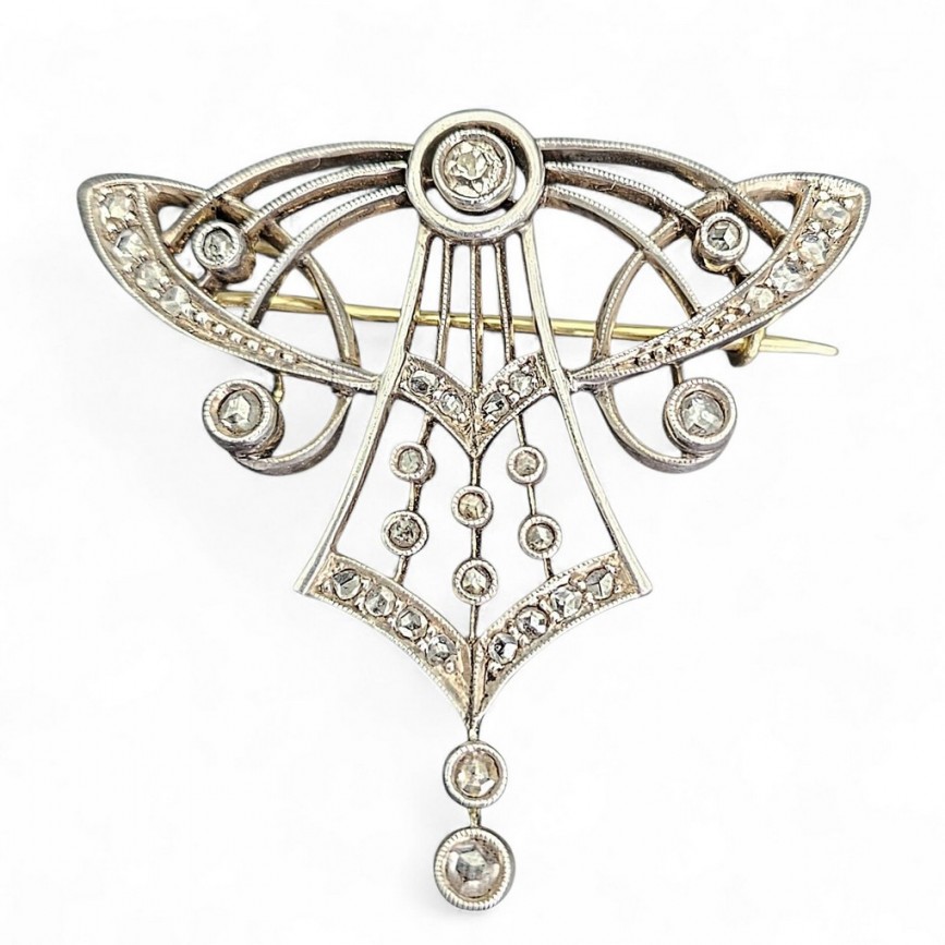 Broșă - pandant Art Nouveau manufacturată în aur galben și argint, decorată cu diamante naturale.