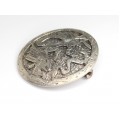 broșă decorată cu scenă inspirată din mitoligia mayașă, ilustrând un șaman practicant al cultului zeului Tlaloc, Zeul ploii și al fertilității, simbolizat de un șapre cu două capete