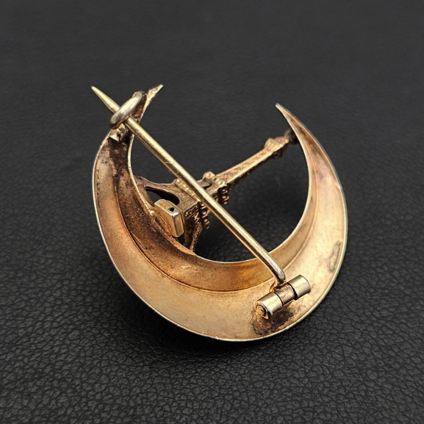 Sistem de prindere cu ac tipic perioadei victoriene târzii, cu balama tubulară și închidere tip „C-clasp”.