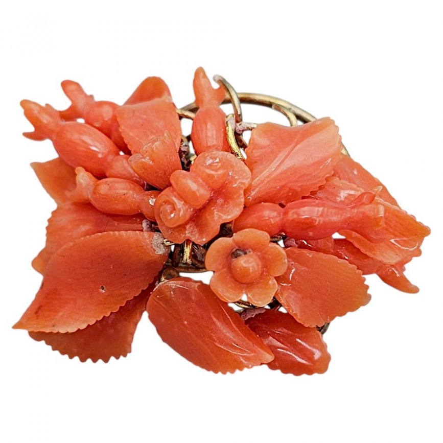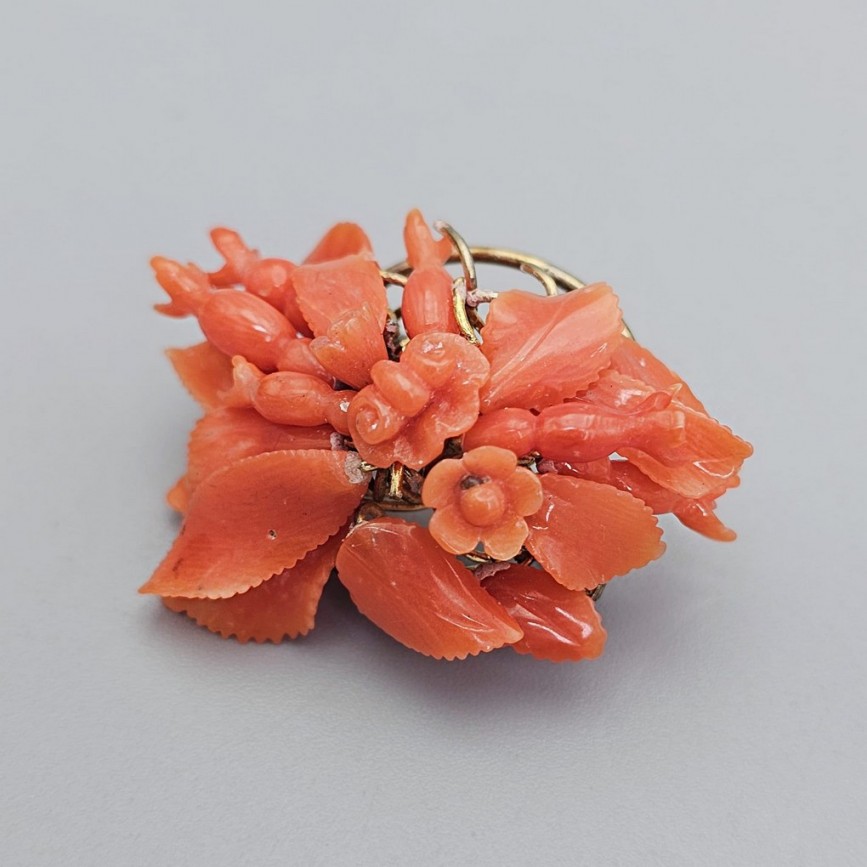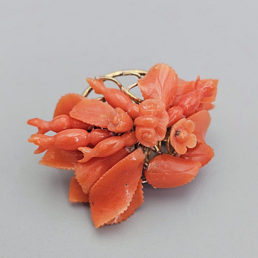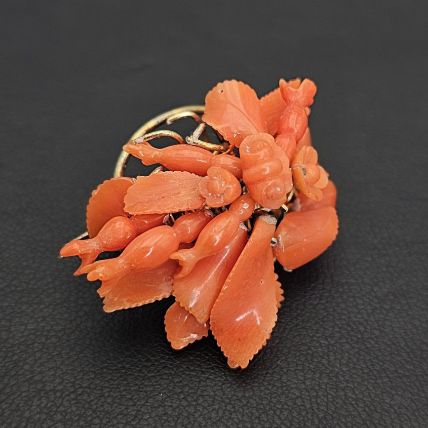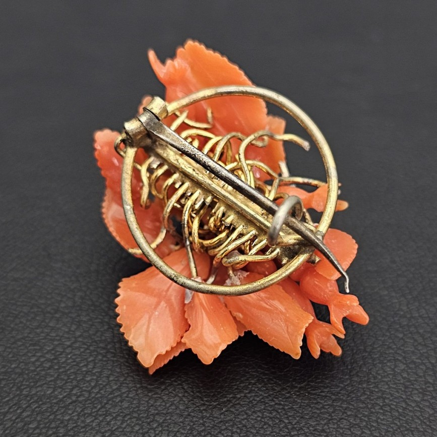 Delicată broșă antique victoriană din argint parțial aurit ( gold wash ) cu anturaje de coral natural sculptate manual.