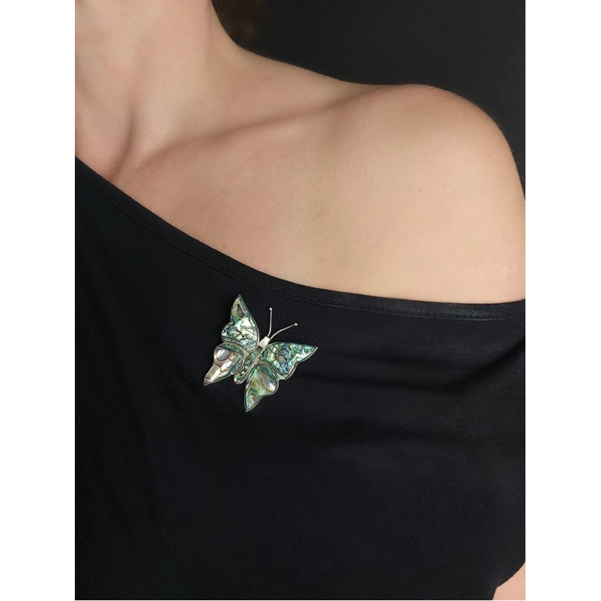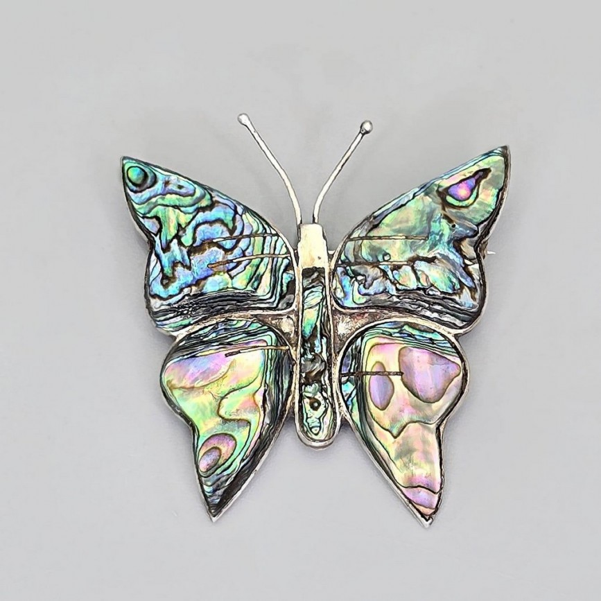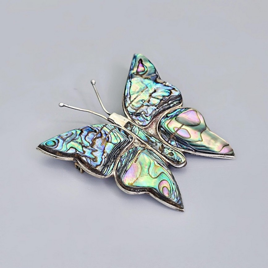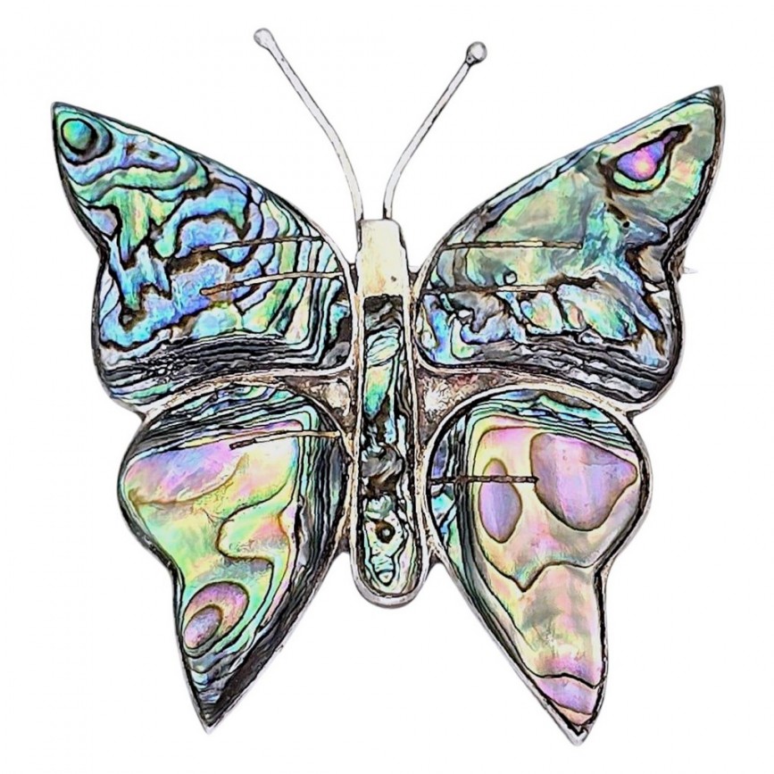 Veche broșă mexicană fluture manufacturată în argint și sidef natural Abalone.