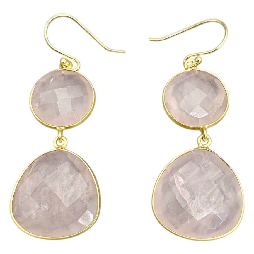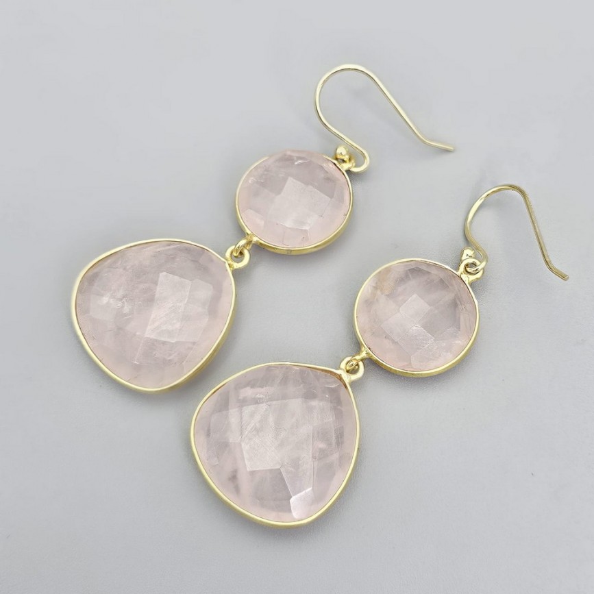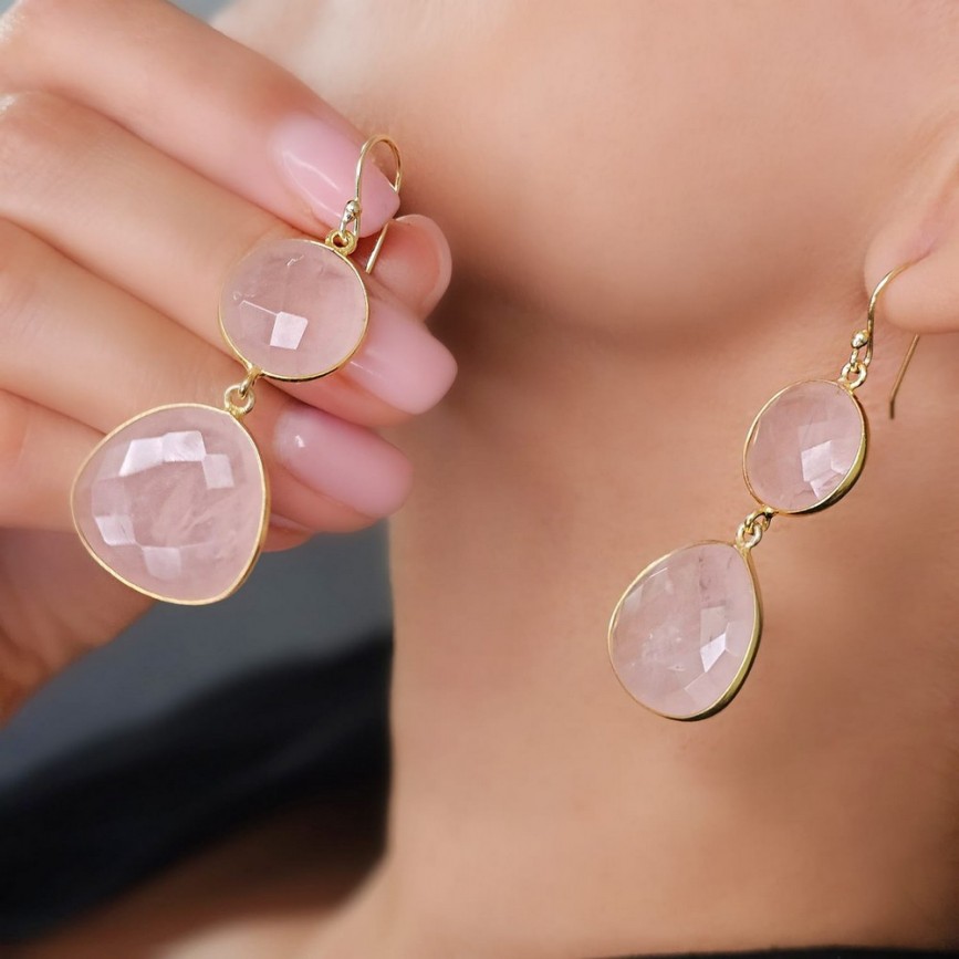 Cercei statement din argint placat cu aur galben, decorați anturaje de cuarț roz natural mutifațetat.