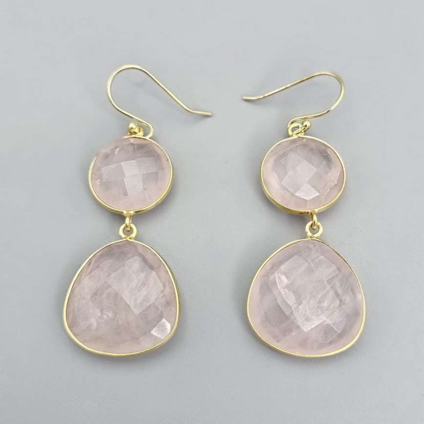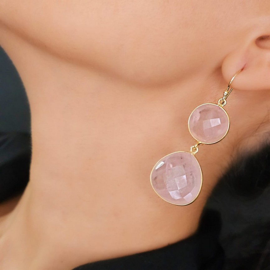 Cercei statement din argint placat cu aur galben decorați cu cuarț roz