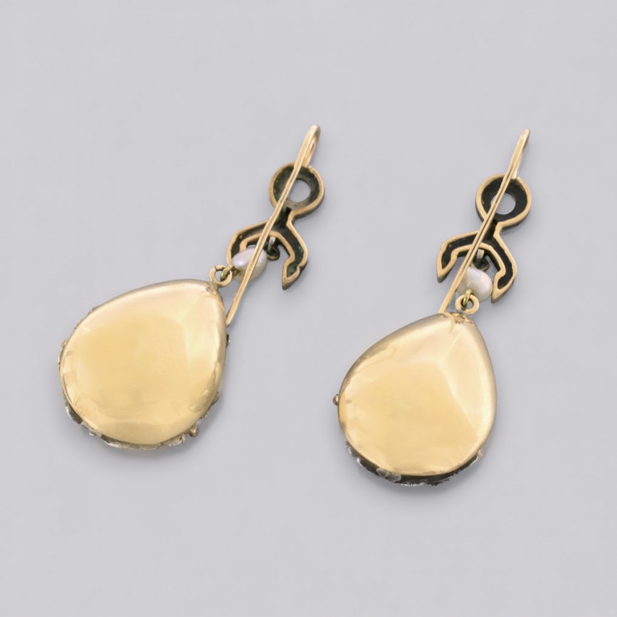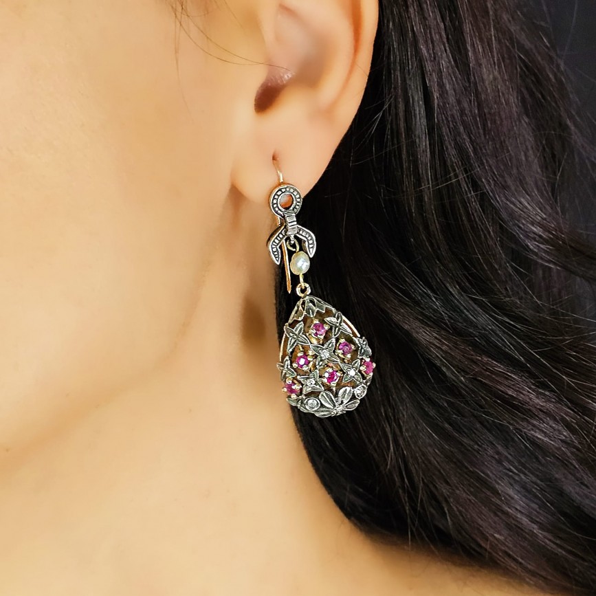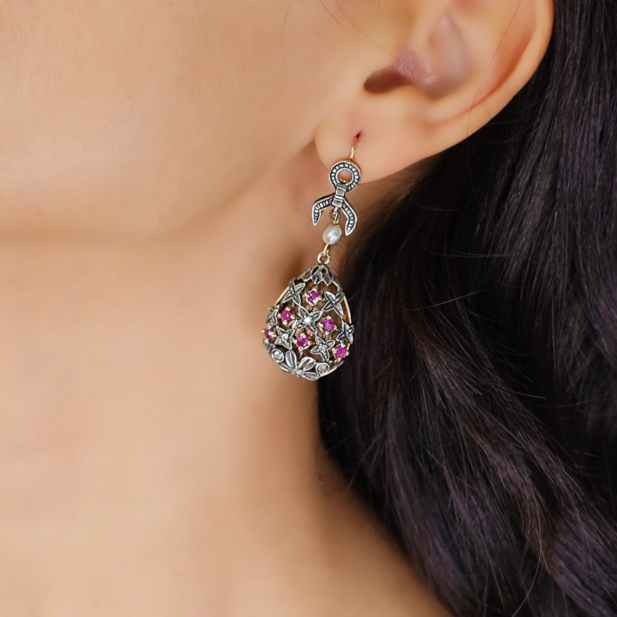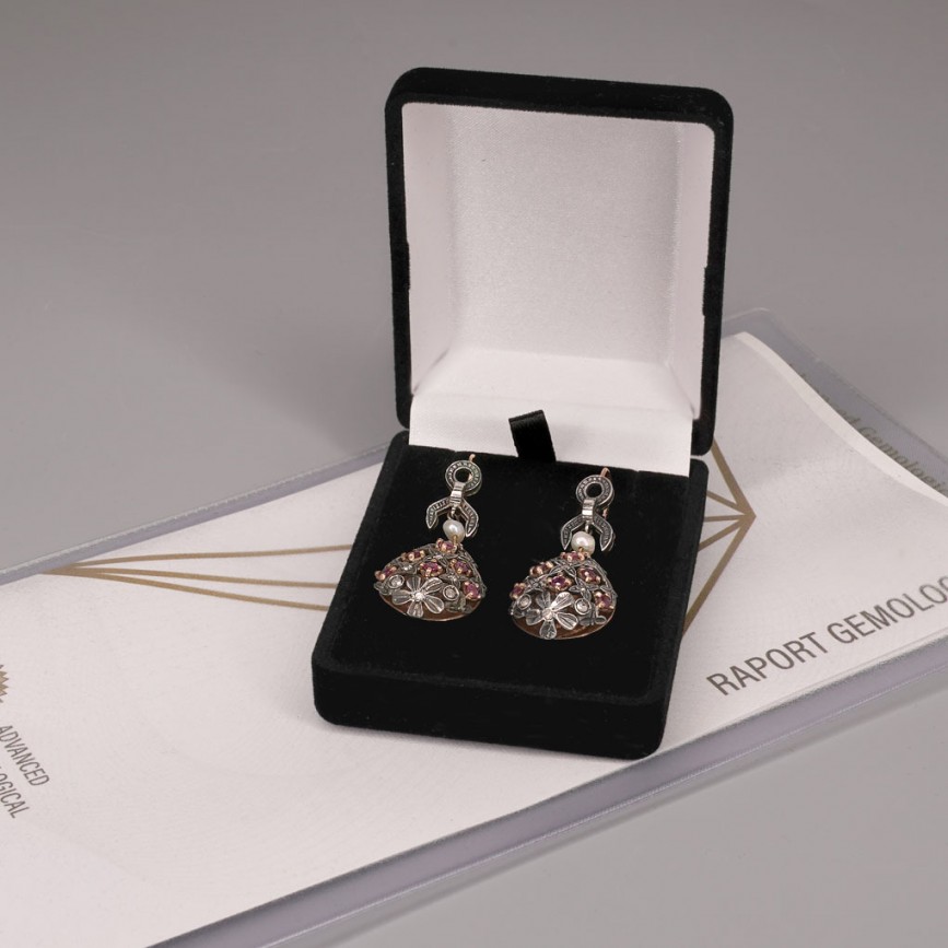 Un exemplu de eleganță Art Deco , acești cercei statement combină rafinamentul tehnic cu delicatețea unui design floral tridimensional, construit în straturi de aur roșu, aur galben 12k și argint cizelat manual. Decorul floral în relief, cu reflexii calde și iridescențe fine, este animat de strălucirea naturală a diamantelor și de tonurile romantice ale safirelor roz, într-o compoziție tipică bijuteriile create în atelierele central-europene de început de secol XX.