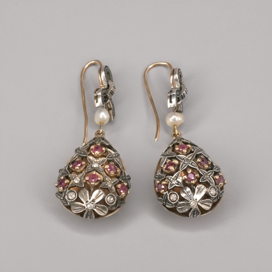 Cercei Art Deco din aur roșu , aur galben 12k și argint decorați cu diamante, safire roz naturale și perle de cultură | cca. 1920 - 1935