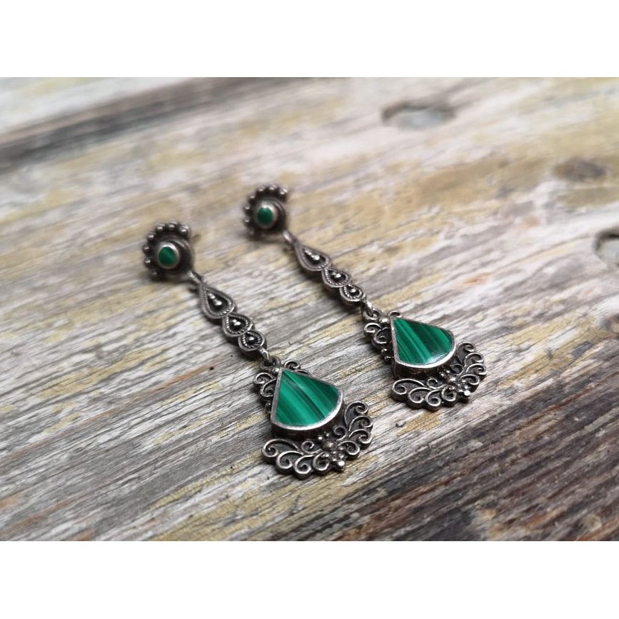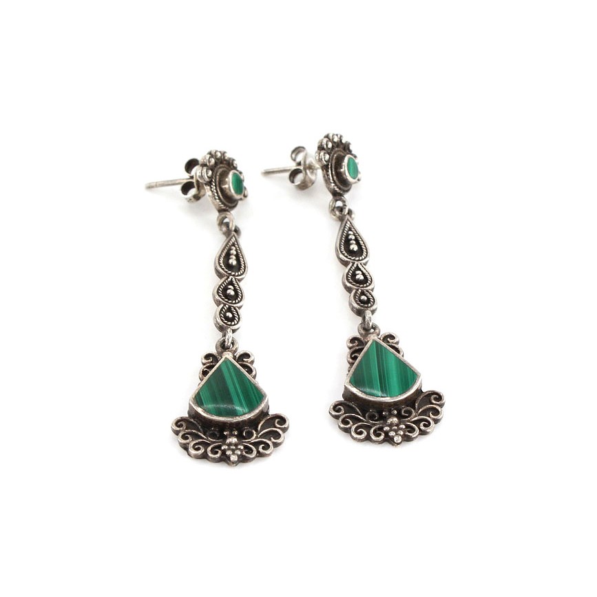 manufactură în argint turnat, presat, granulat, filigranat şi cizelat; malachit