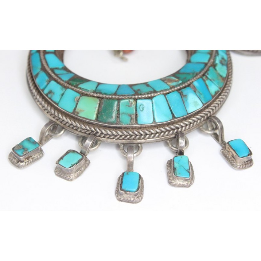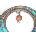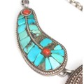 colier tribal nepalez, cu anturaje de turcoaz antic tibetan si coral natural