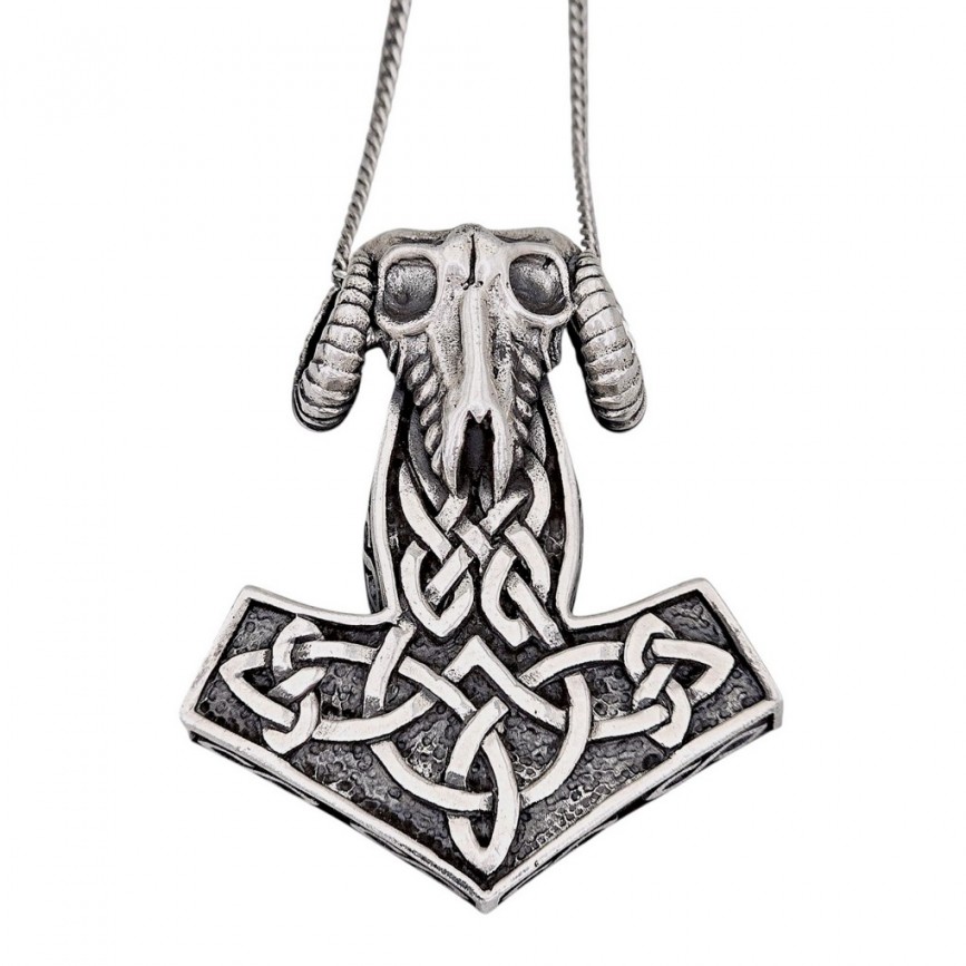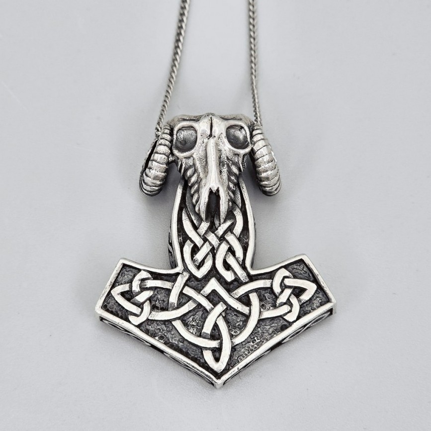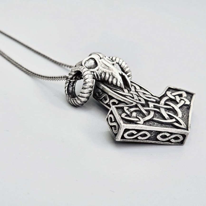 Colier din argint cu pandant statement Mjollnir decorat cu meandre celtice și bucraniu