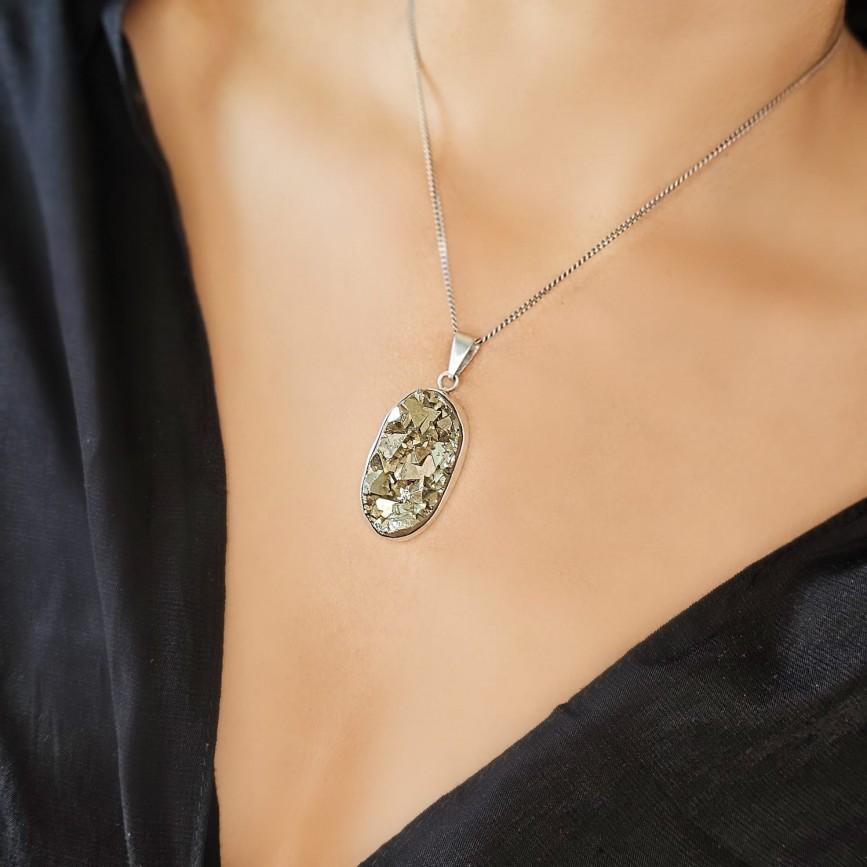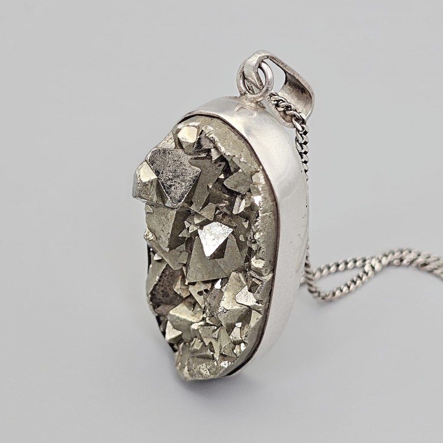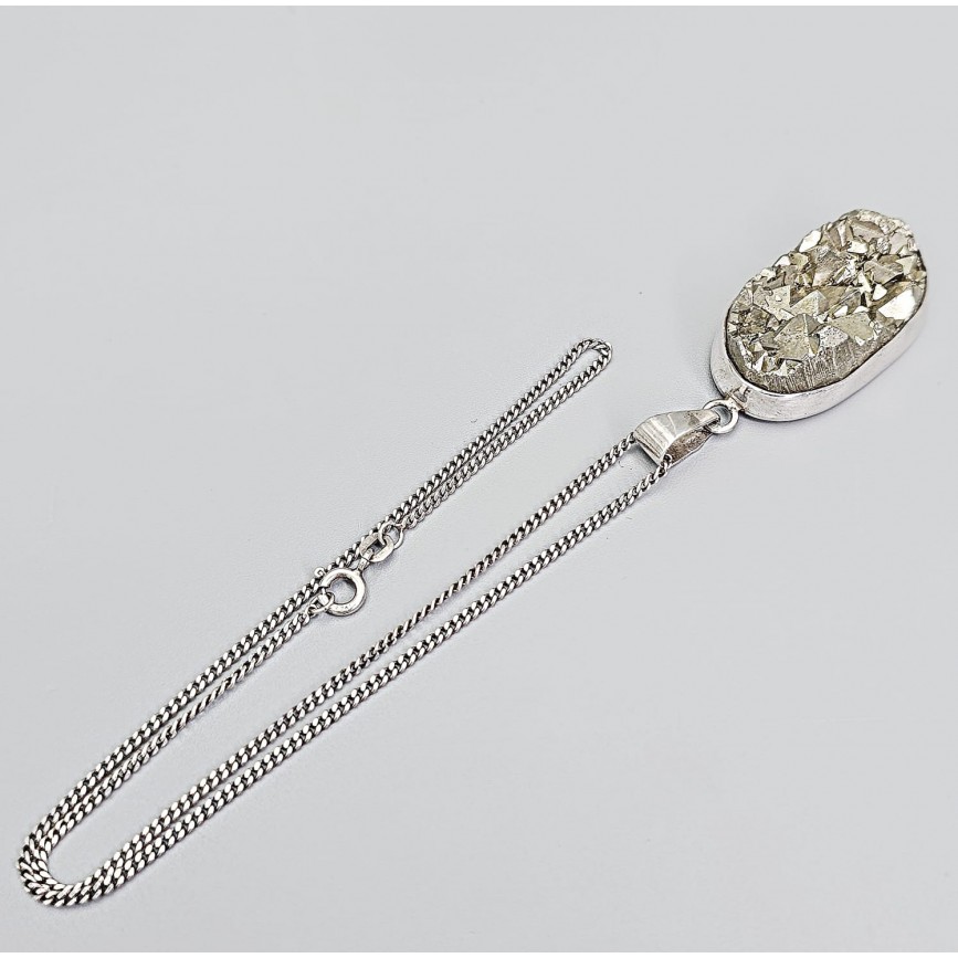 Colier accesorizat cu pandant statement manufacturat în argint decorat cu un spectaculos anturaj de pirită naturală în formă brută.