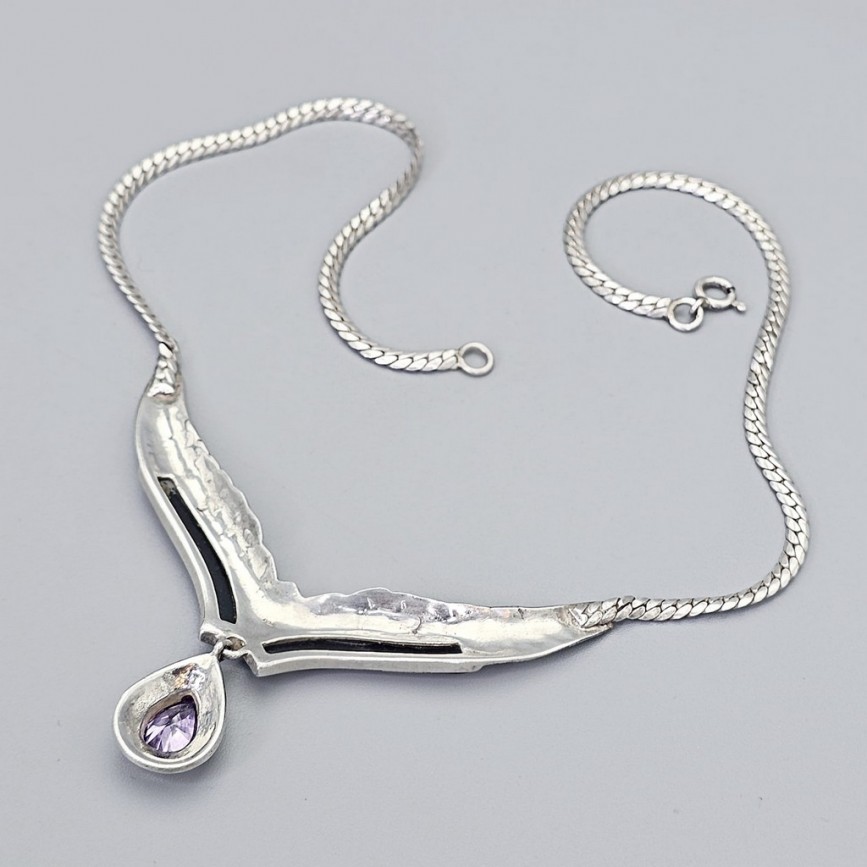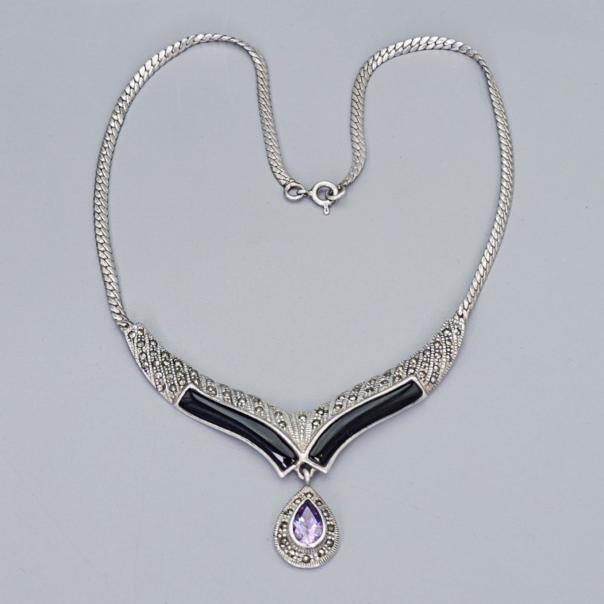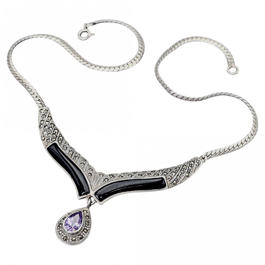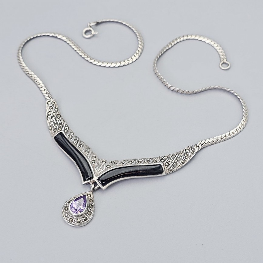 Elegant colier din argint cu design de factură Art Deco, minuțios încrustat cu marcasite și decorat onix și ametist natural.