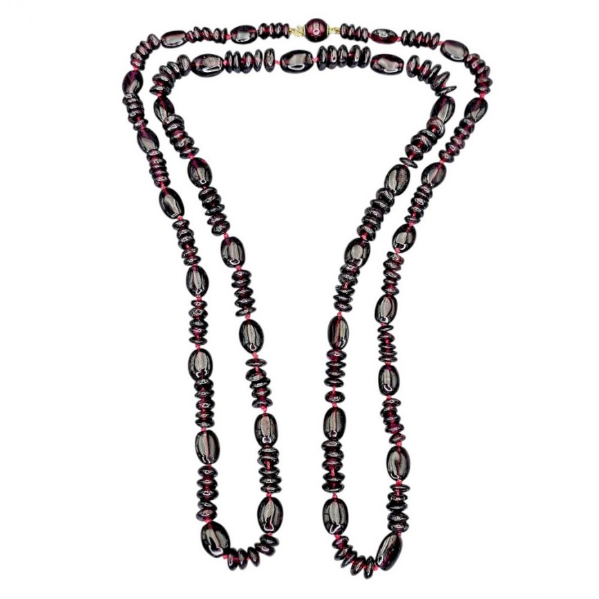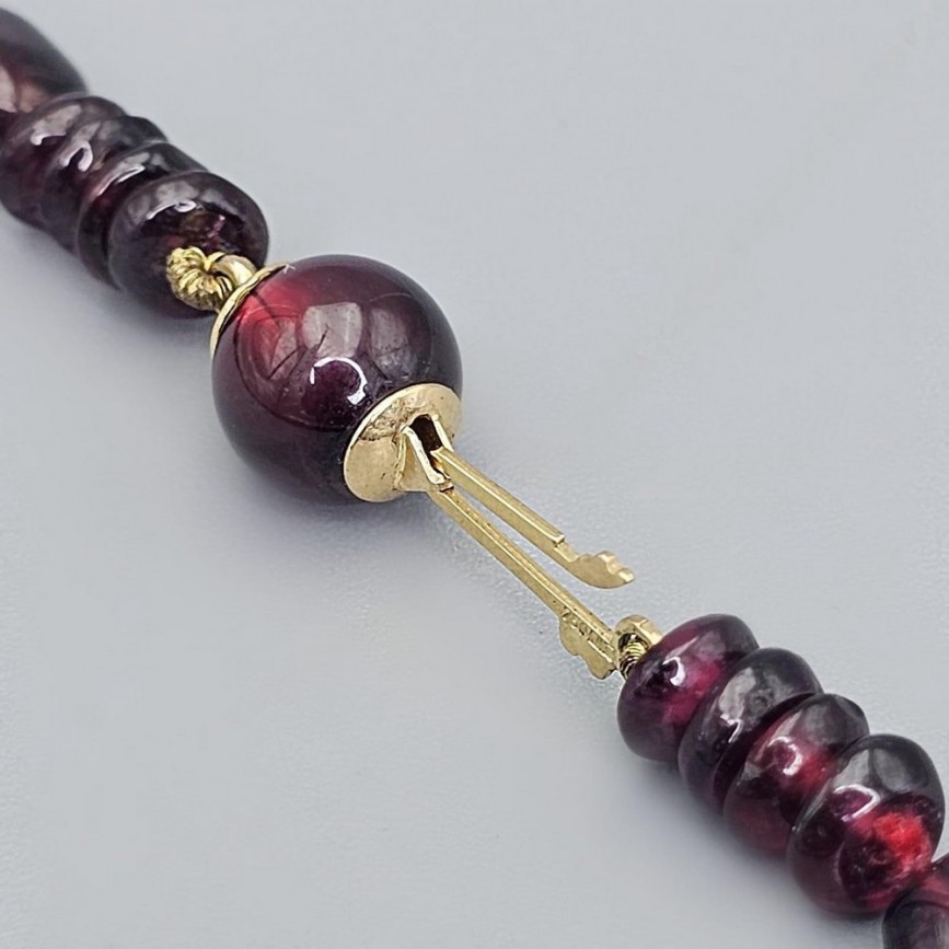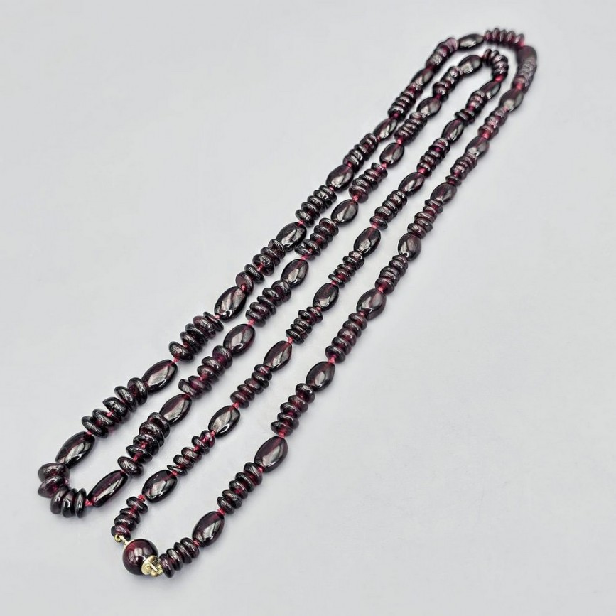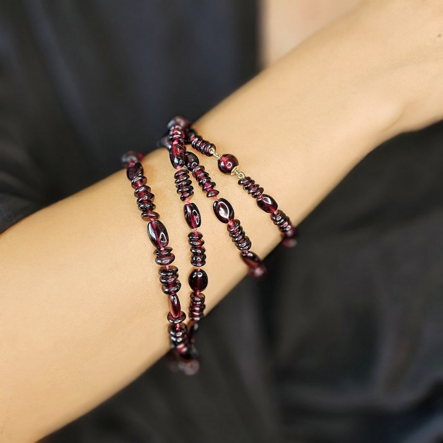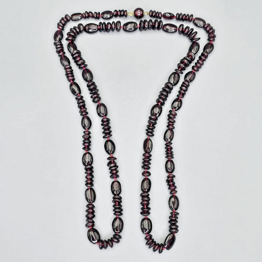 Granate naturale dispuse pe fir de mătase cu spațiere realizată prin înnodare manuală.