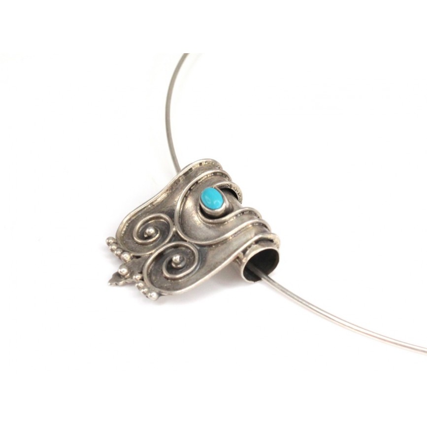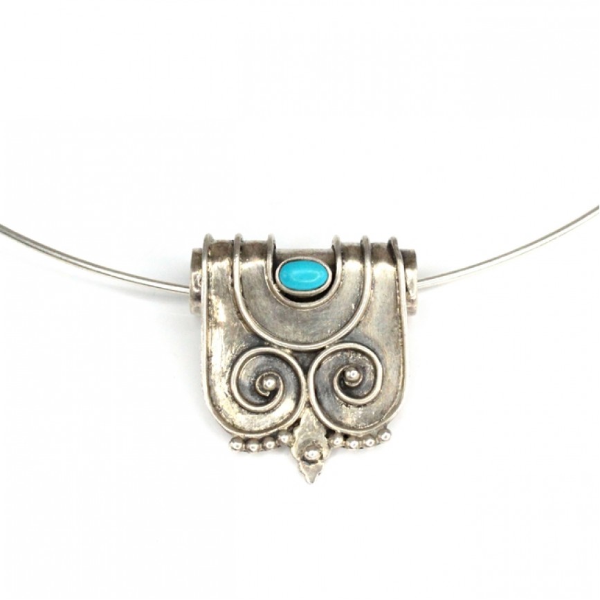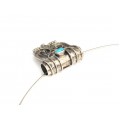 Amuletă elegant stilizată în manieră specifică artizanilor din regiunea Rajasthan, decorată cu un delicat anturaj de turcoaz persan.