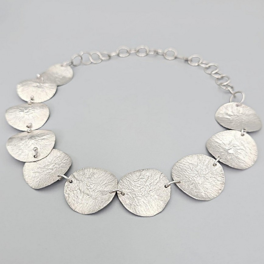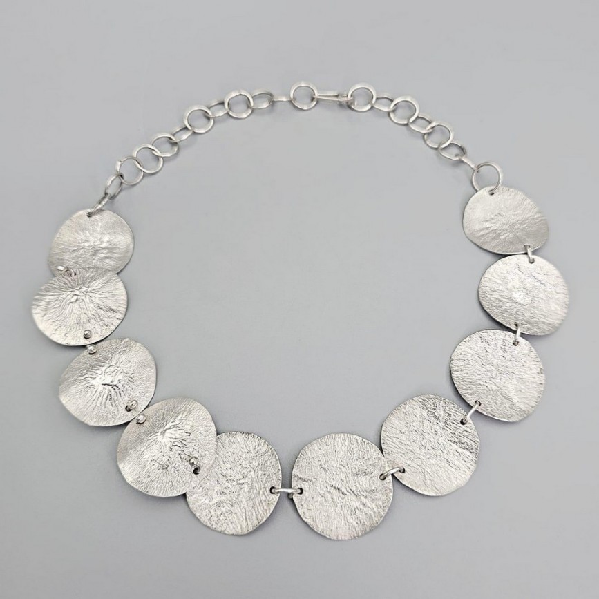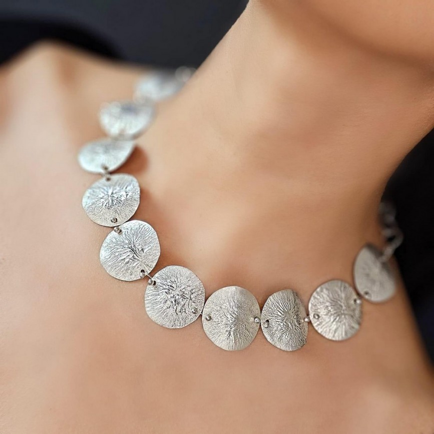 Remarcabil colier choker de perioadă mid-century, manufacturat din argint cu accente texturate prin reticulare tehnică ce conferă fiecărui element unicitate organică.