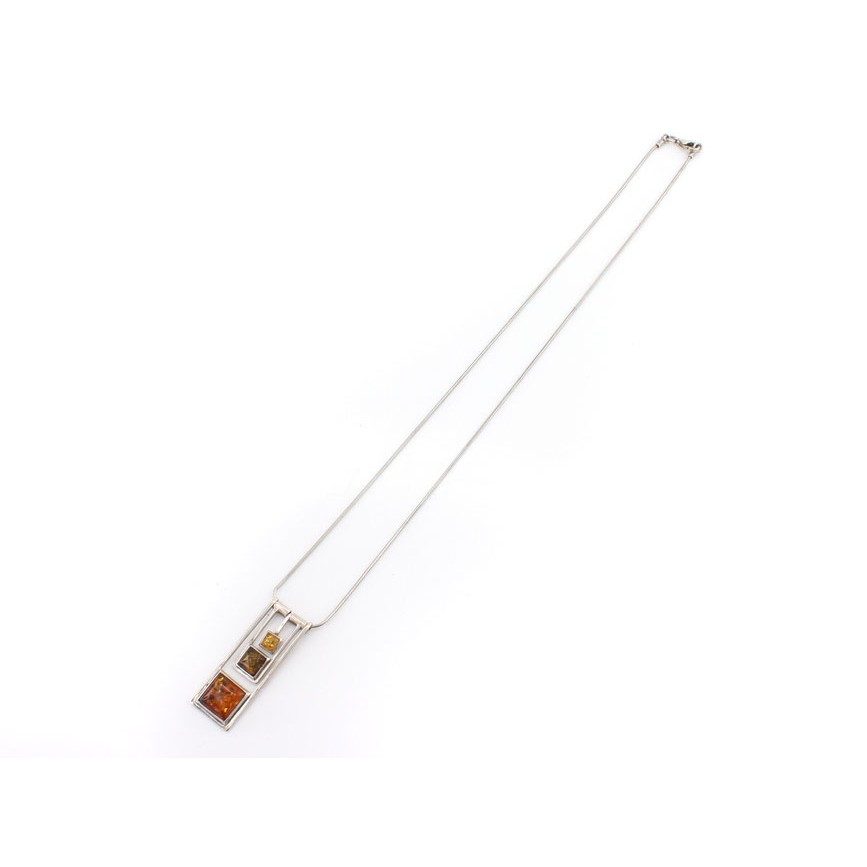 Pandantiv format din 3 segmente batante, decorate cu anturaje patrulaterice de chihlimbar, geometrizate prin șlefuire.