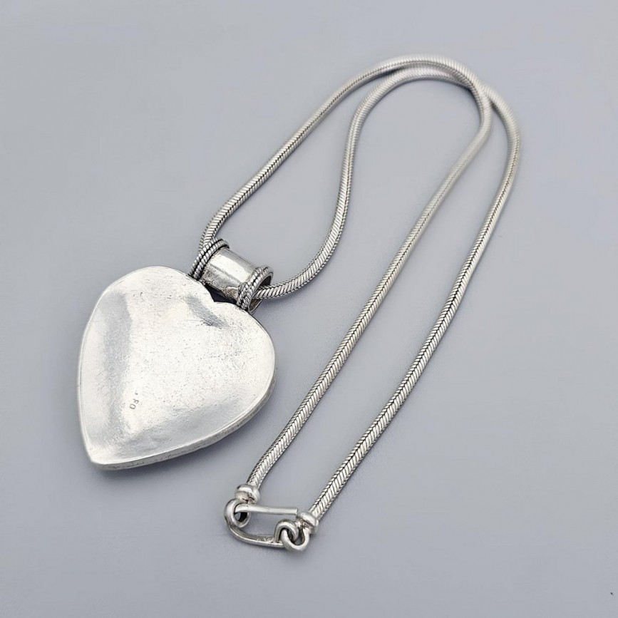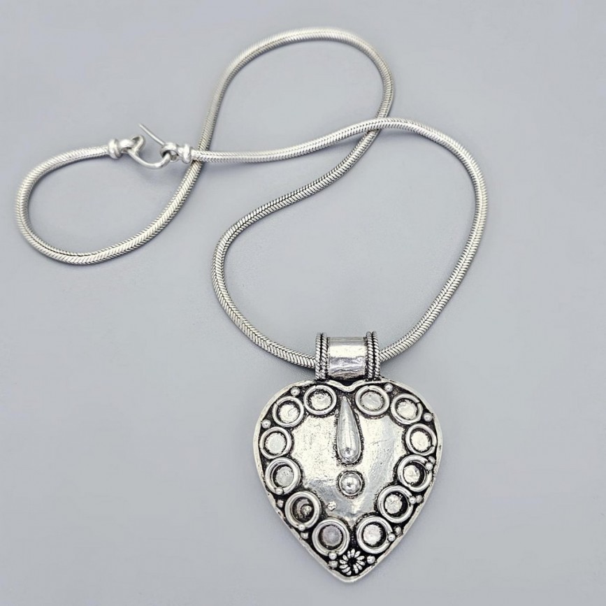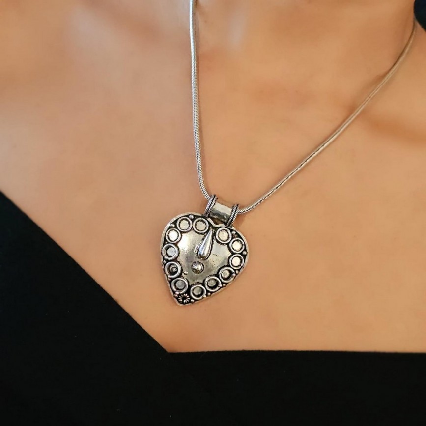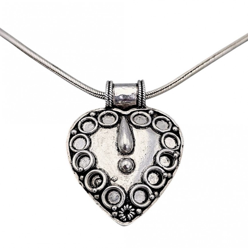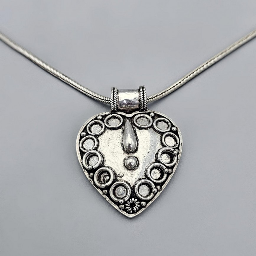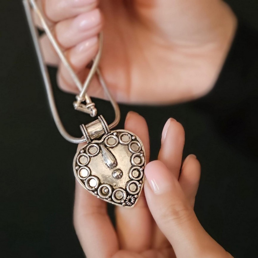 Lanțul masiv din argint împletit, susține o amuletă etnică în formă de inimă, decorată manual în relief cu cercuri și granule simbolice,