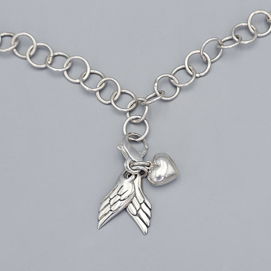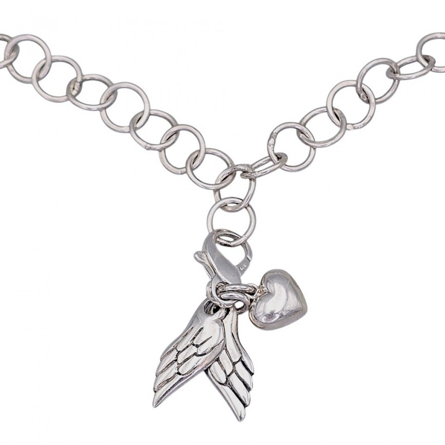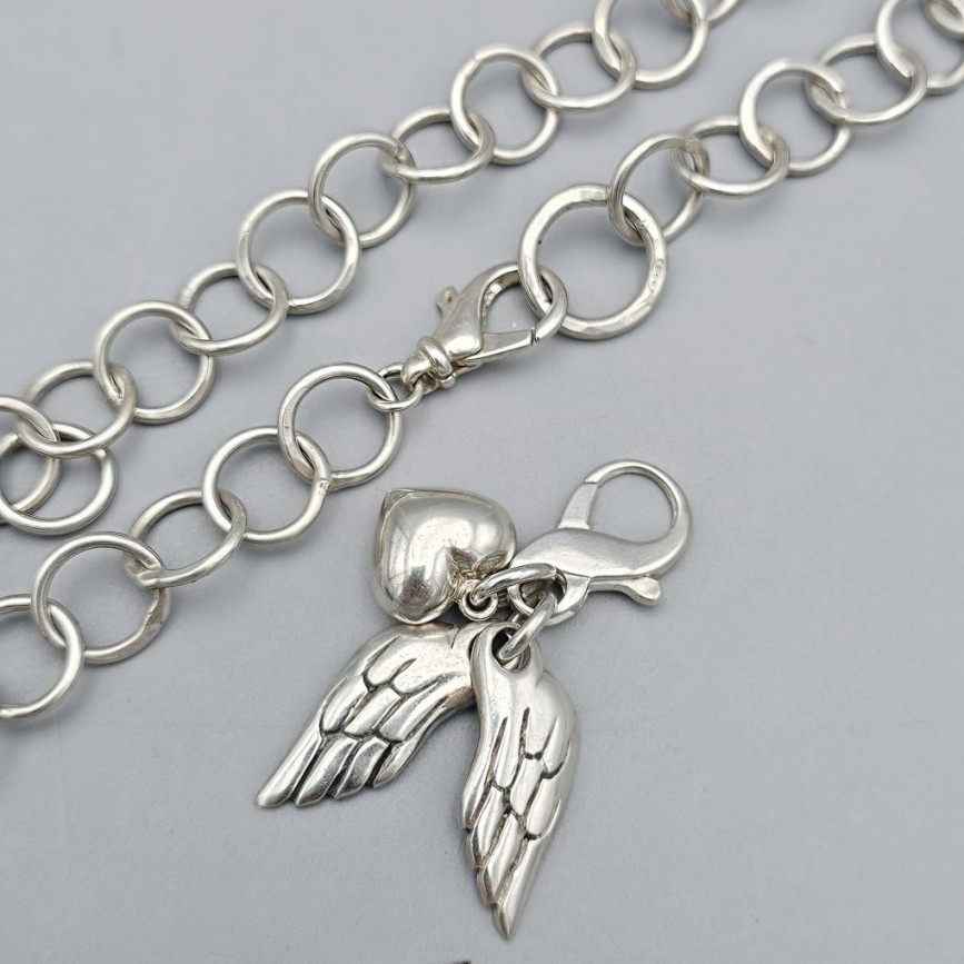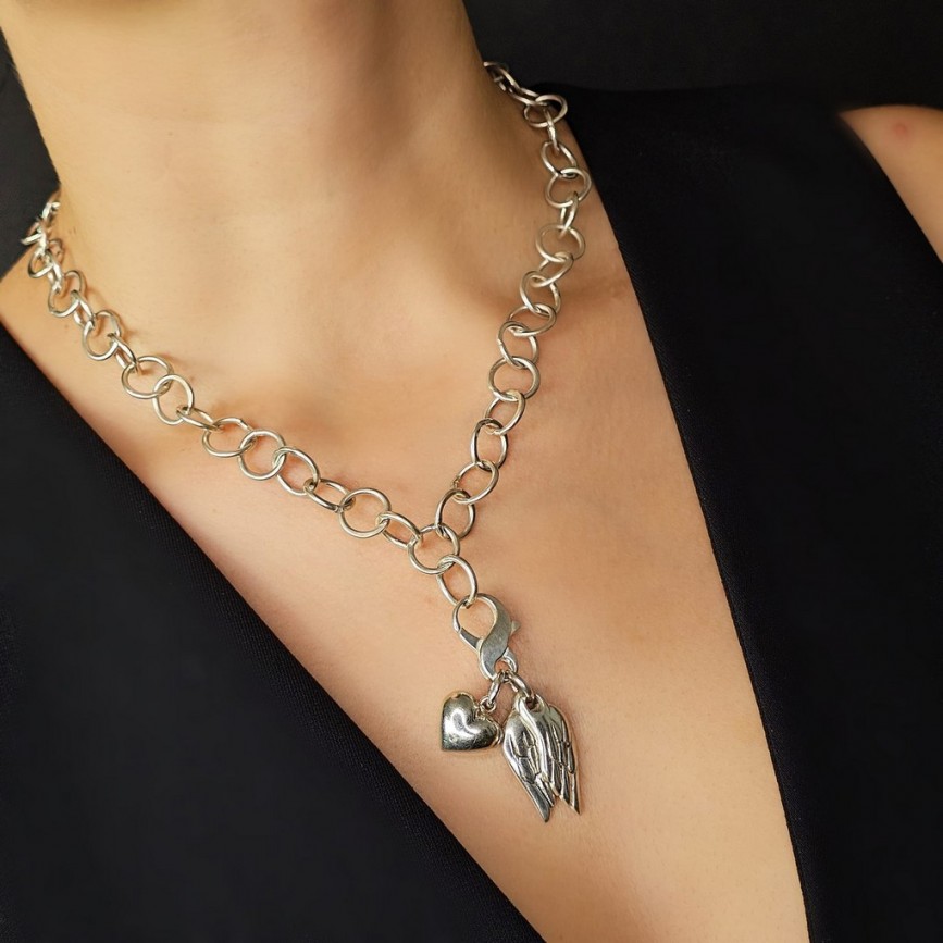 Lanț din zale rotunde masive cu pandant Valentine detașabil, cu charmuri stilizate sub formă de inimă volumizată și o pereche de aripi,