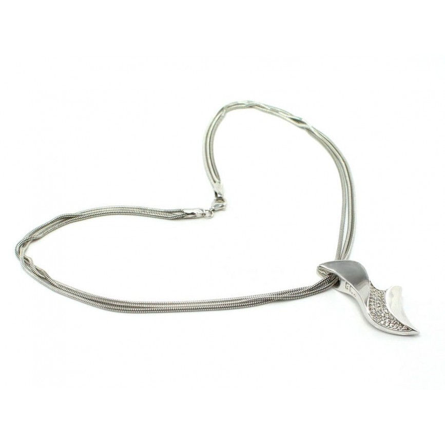 Colier multistrand accesorizat cu un pandant elaborat în stil specific futurismului contemporan.
