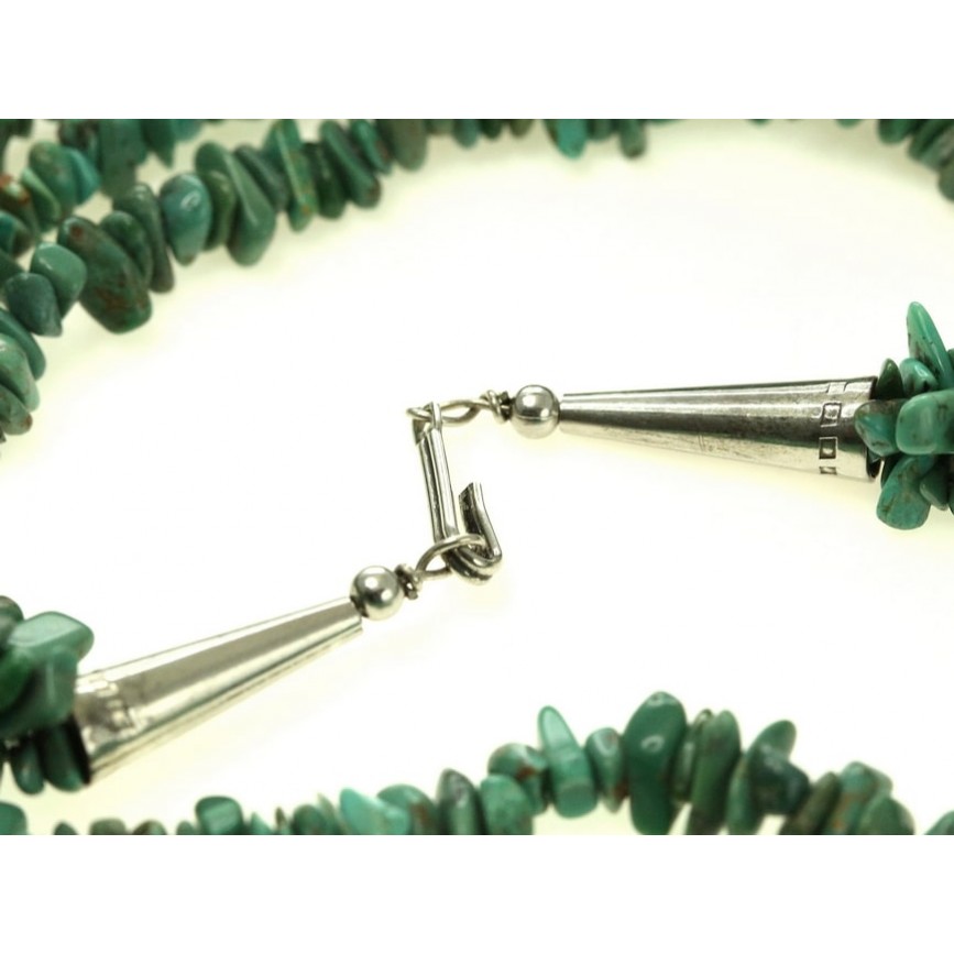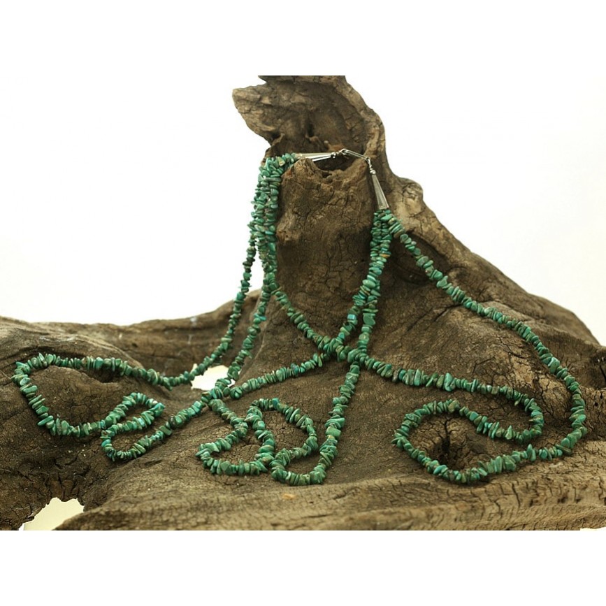 Colier " multi strand ", bijuterie etnică amerindiană, decorată cu turcoaze naturale dispuse pe 3 șiaraguri din fibre naturale.