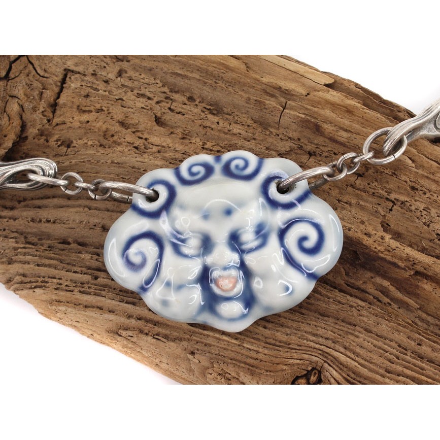 Elemente decorative din porțelan glazurat, stilizate sub forma unor forma unor efigii antropomorfizate inspirate din mitologia Orintului Îndepărtat.