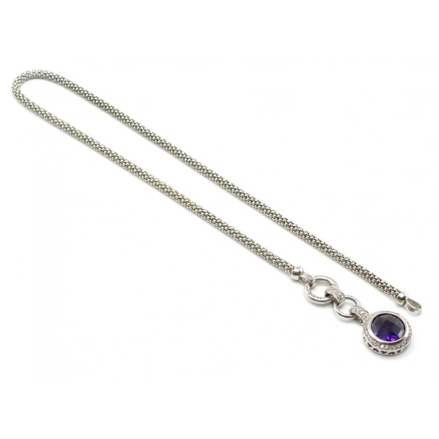 Elegant colier statent din argint 925, accesorizat cu pandantiv decorat cu un impresionant anturaj de ametist de sinteză.