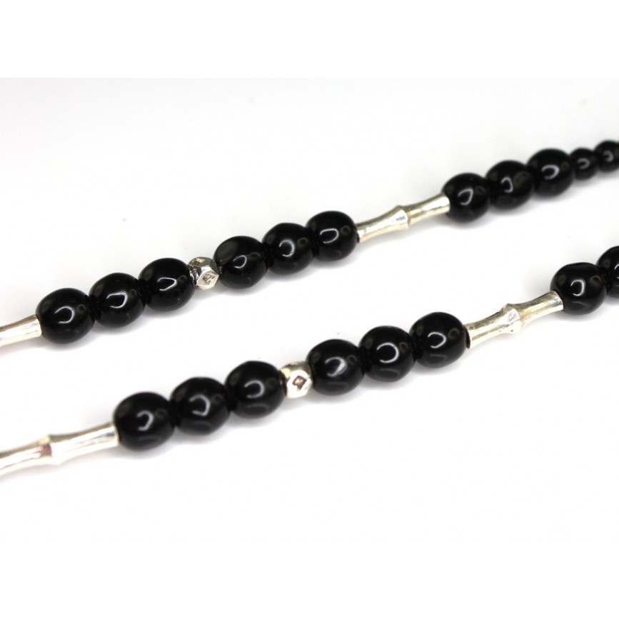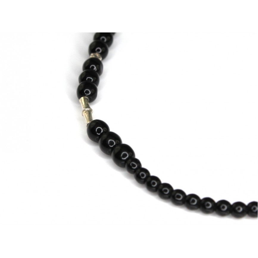 șirag format din elemente cabochon de onix negru, dispuse pe fire din fibre naturale