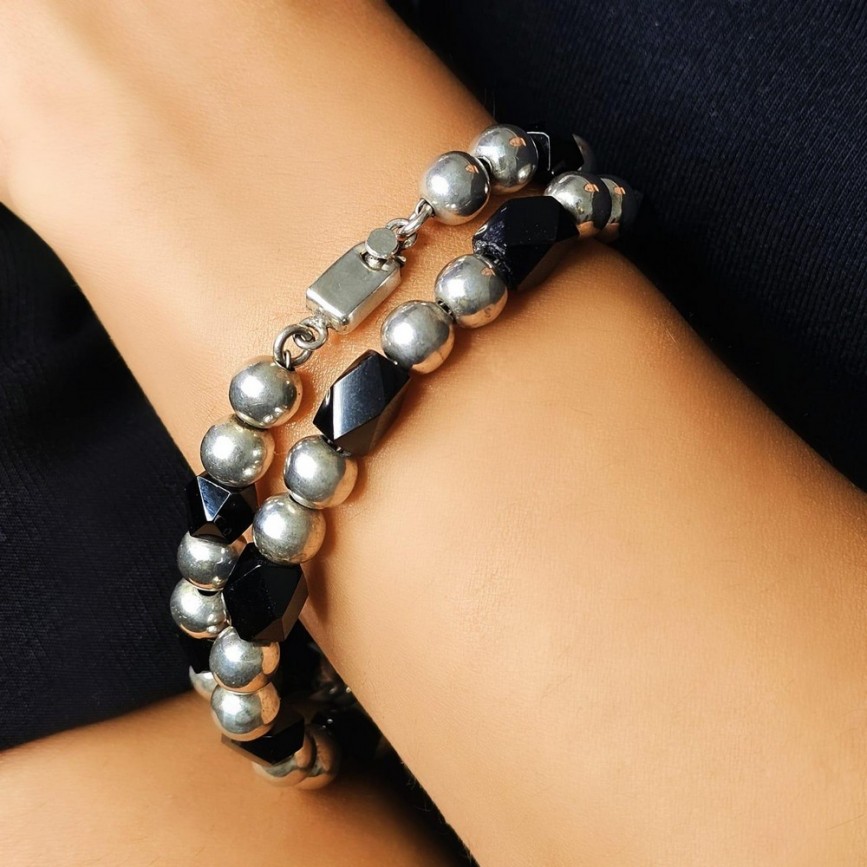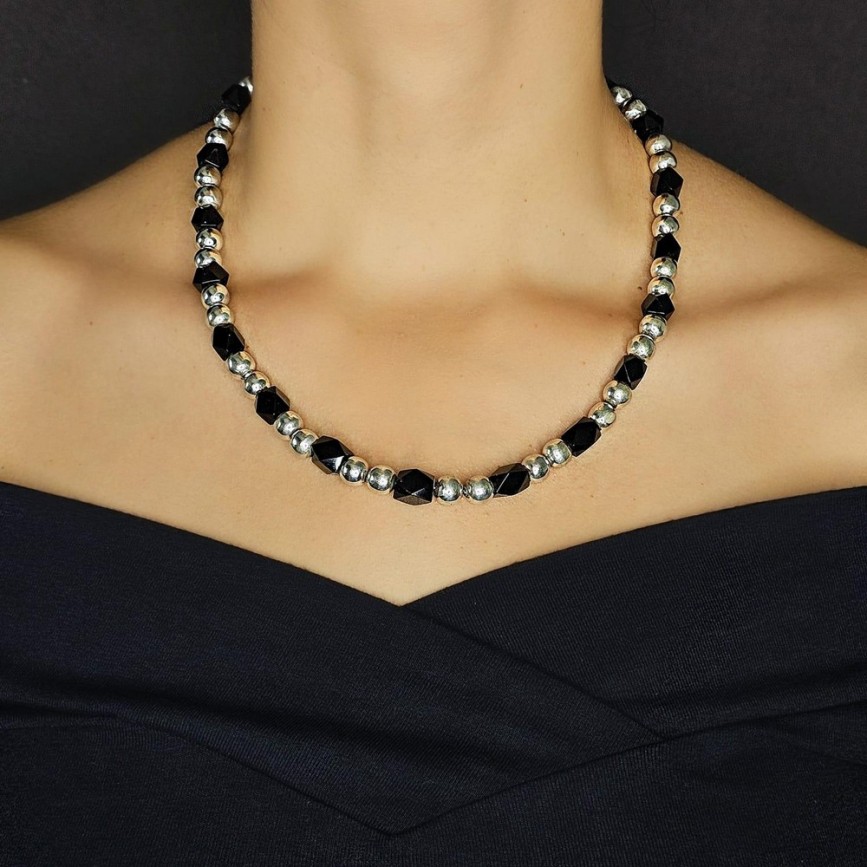 O bijuterie cu prezență grafică puternică , un dialog între lumină și materie, între reflexia argintului și adâncimea neagră a pietrei vulcanice.