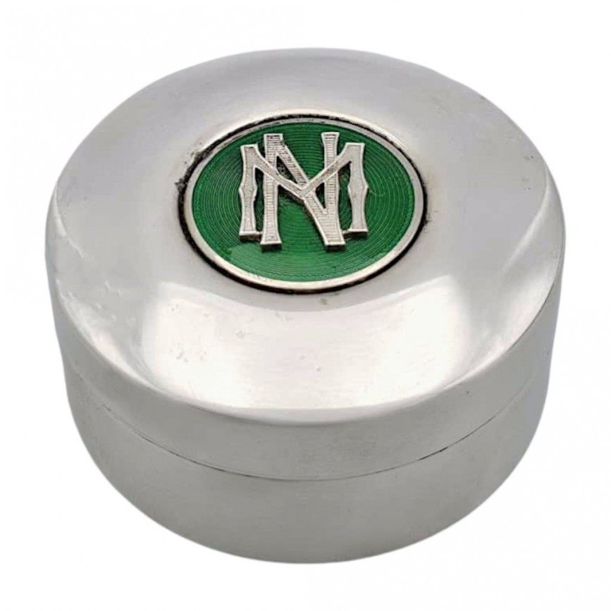 Cutiuță pillbox de perioadă Art Deco din argint emailat champlevè & monogramă " M N "
