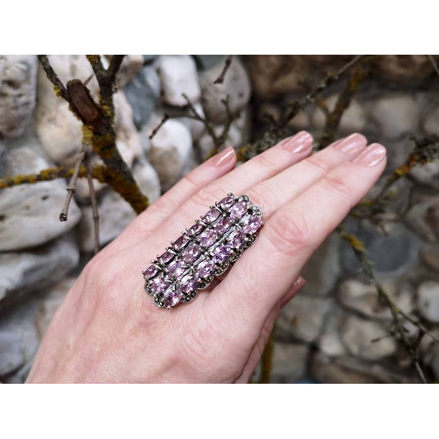 Impresionant inel statement, tip "cocktail" decorat cu o spectaculoasă suită de cristale multifaţetate de rodolit roz, natural.