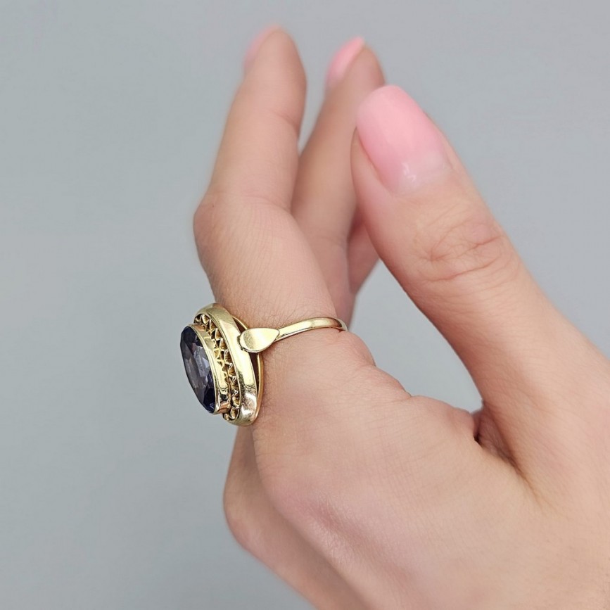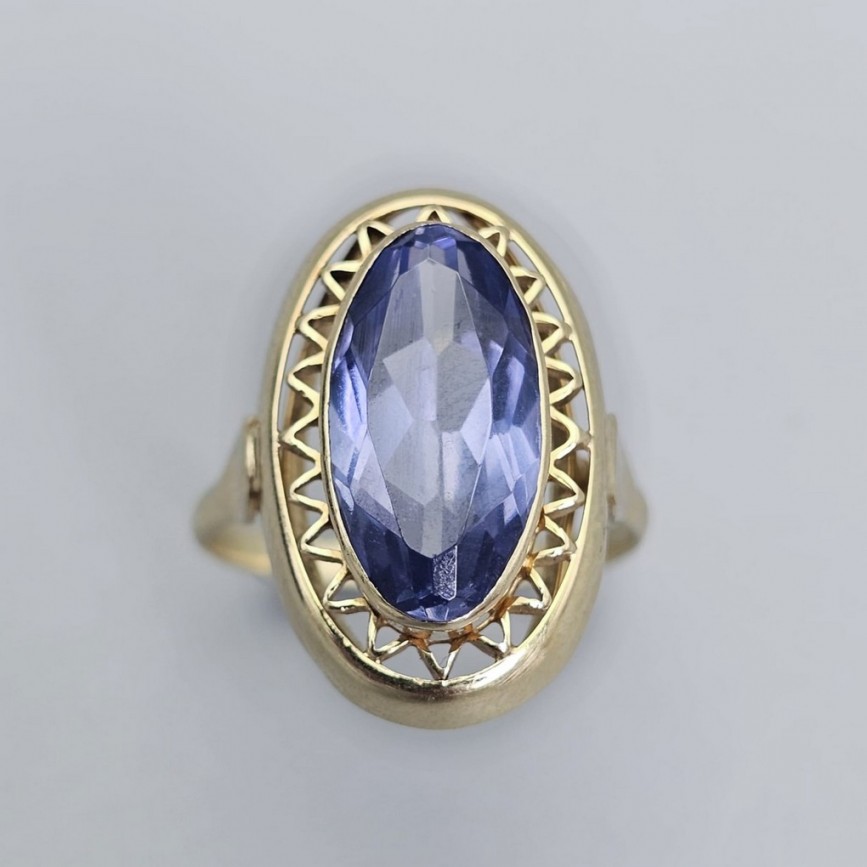 manufactură în aur galben 14k turnat, presat și cizelat; spinel albastru liliachiu