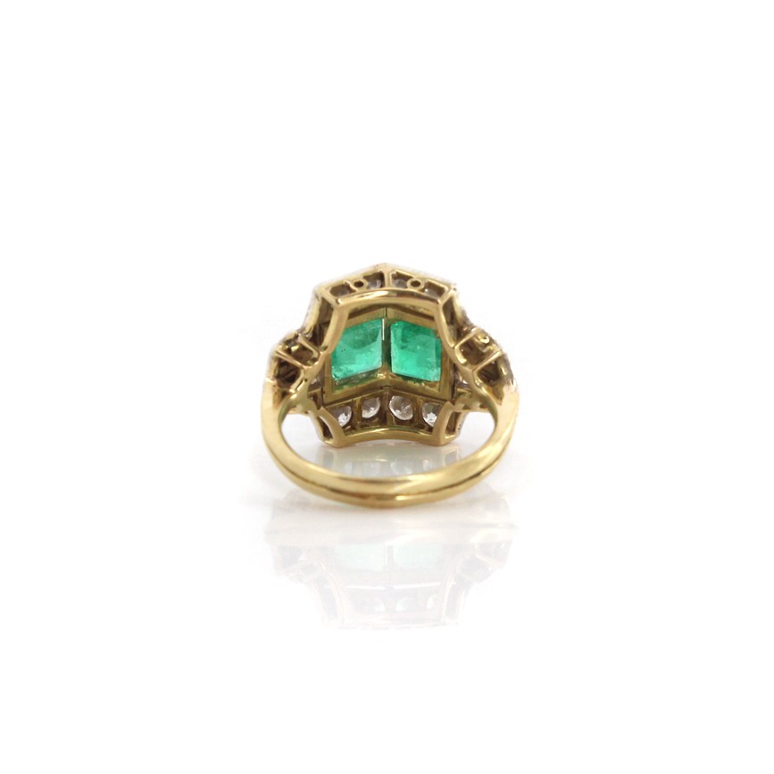 Spectaculos inel Art Deco, manufacturat în aur galben și argint, având coronamentul decorat cu două superbe smaralde naturale și suită de briliante: