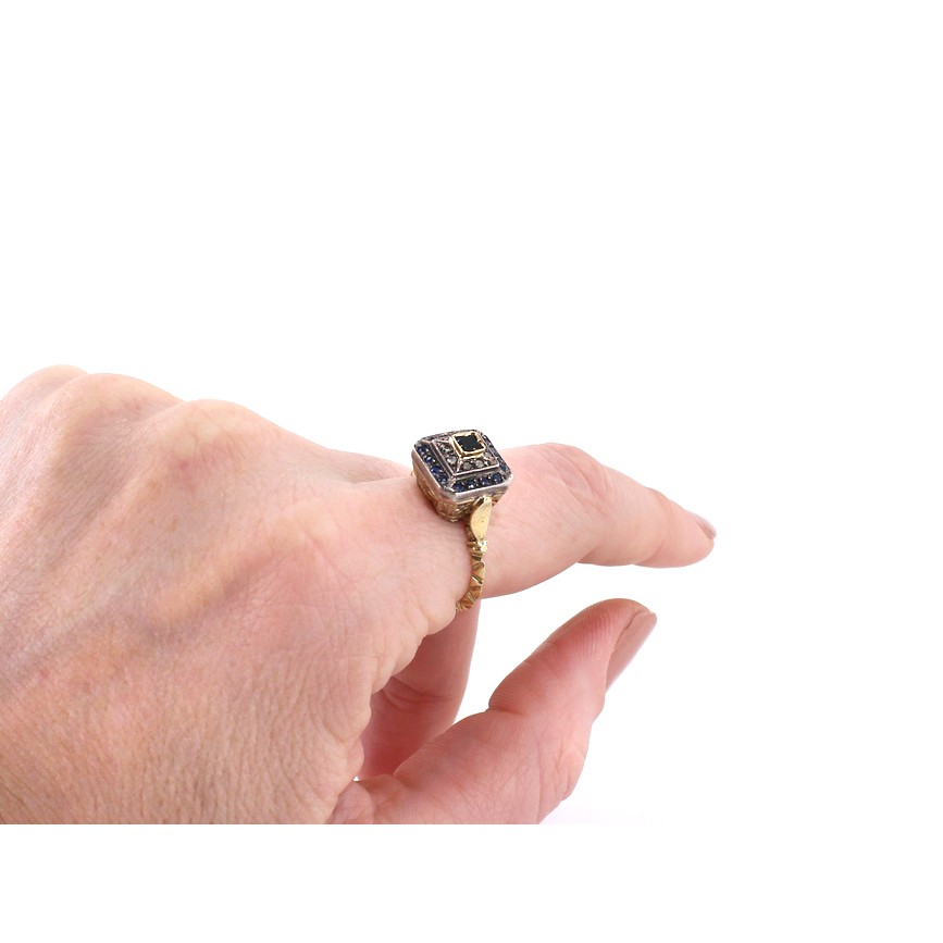 Elegant inel Art Deco splendid manufacturat în aur galben și argint decorat cu o bogată suită de safire și diamante naturale: