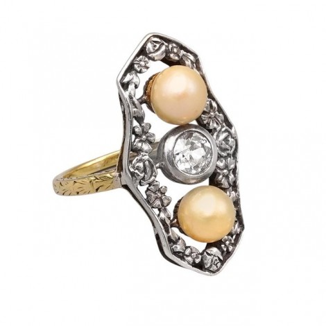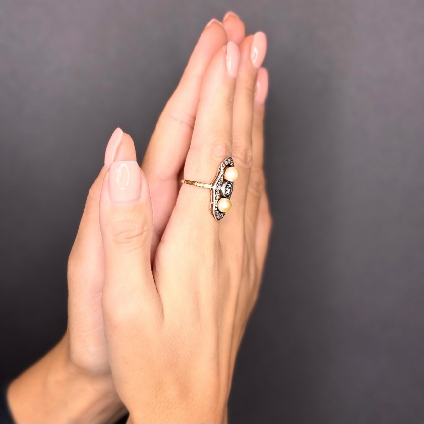 Elegant inel autentic Art Deco, manufacturat în aur galben 18k, aur galben 14k și argint, decorat cu perle naturale Akoya și diamante naturale: