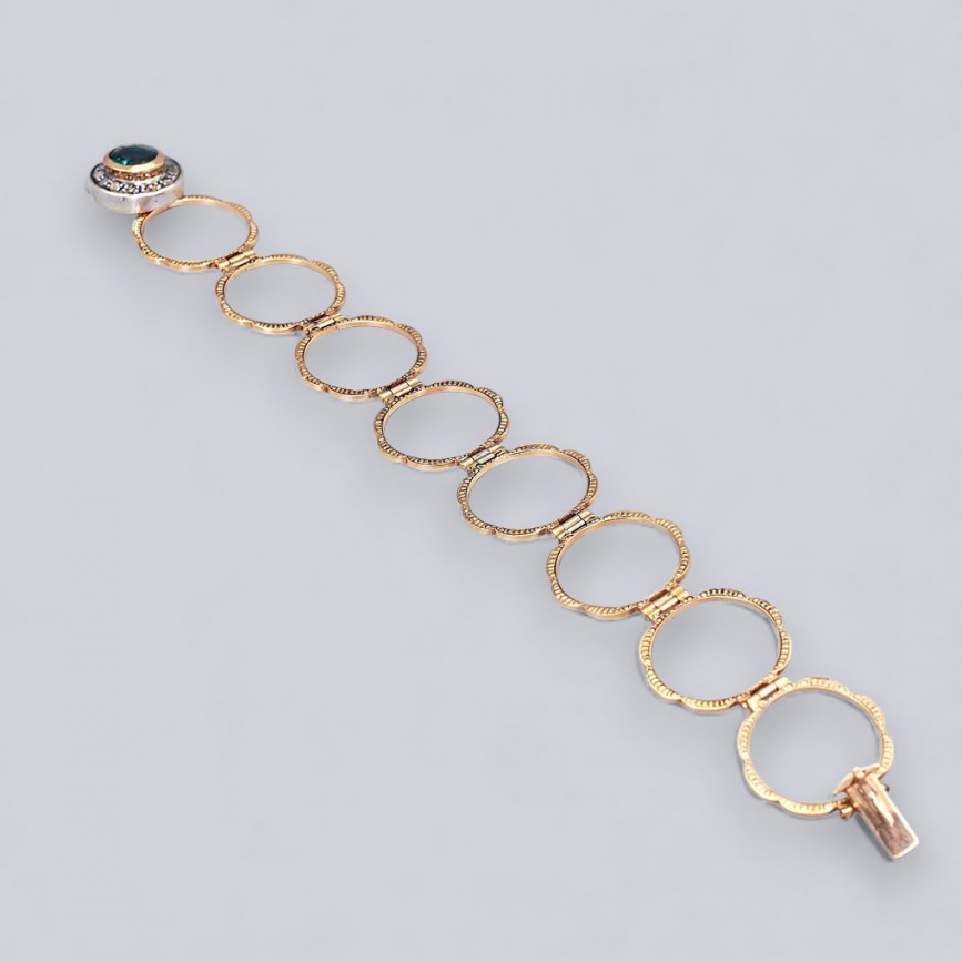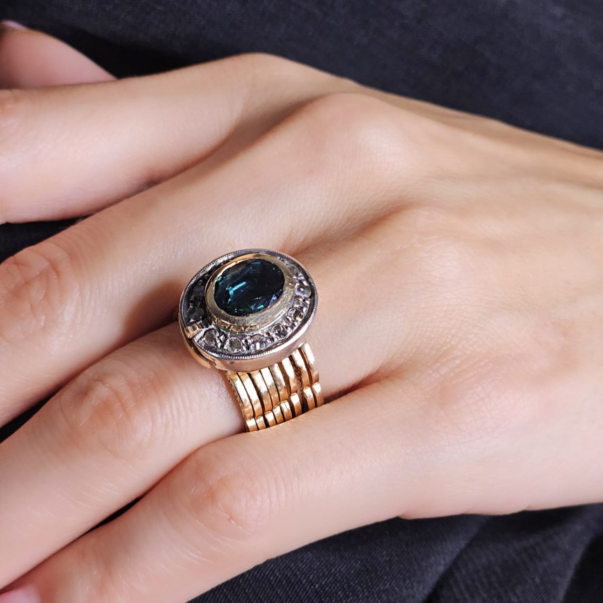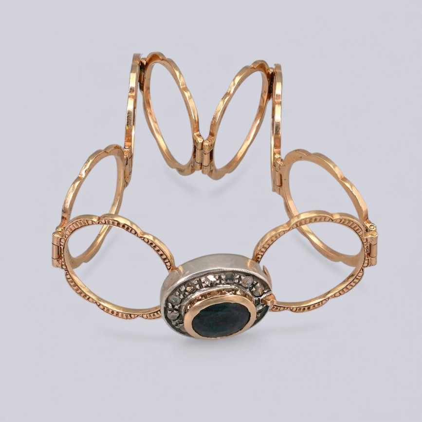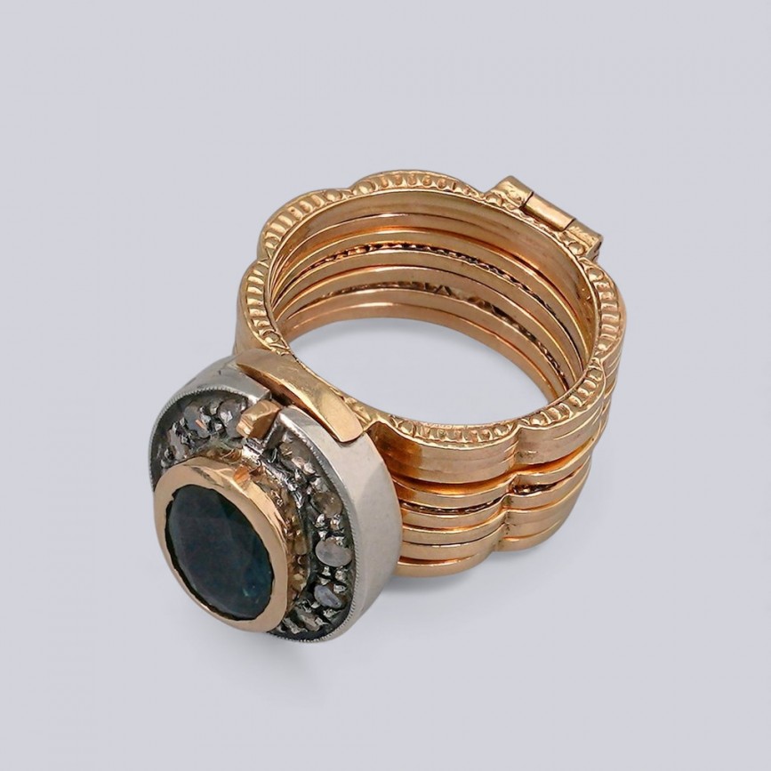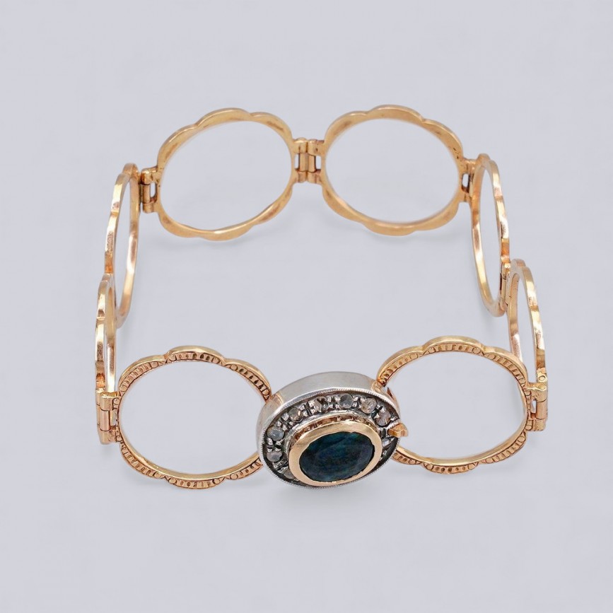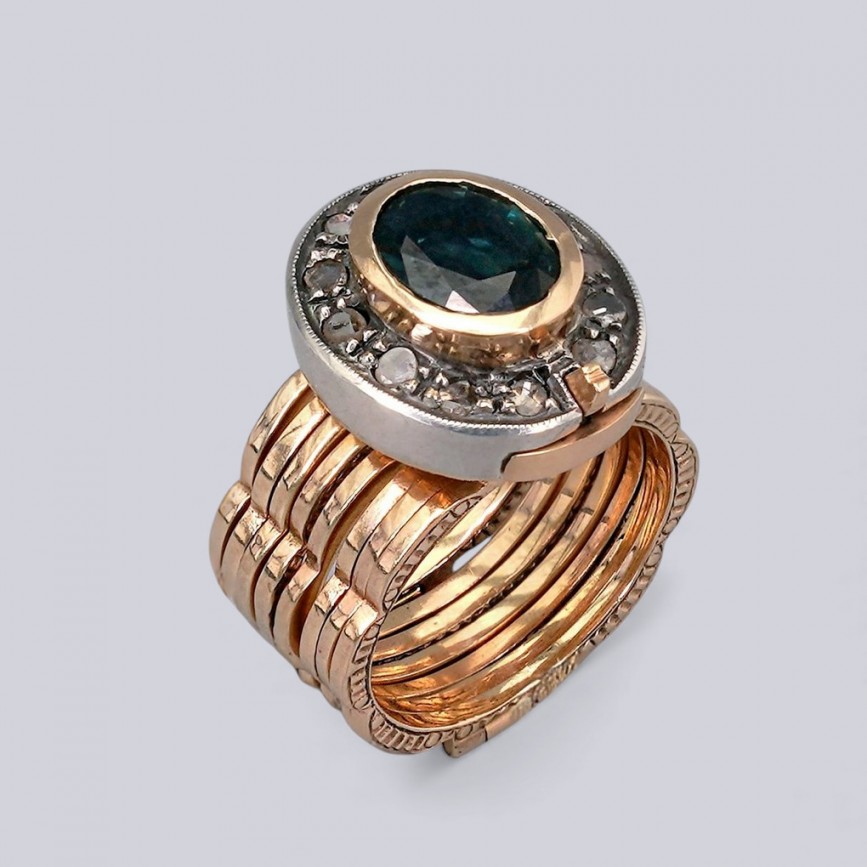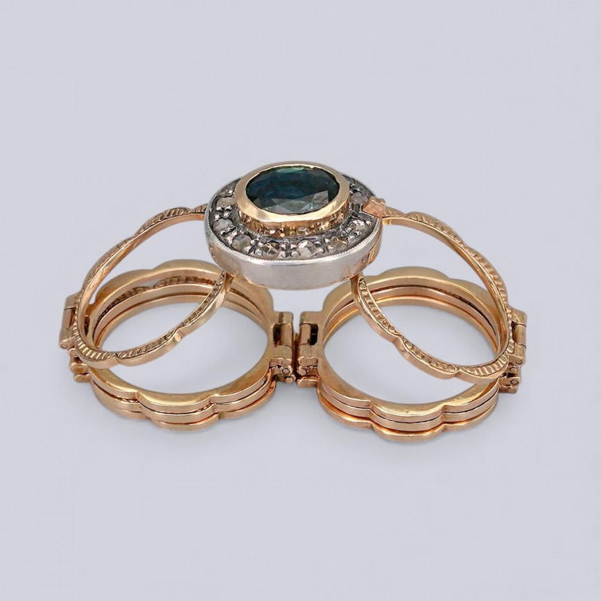 Inedit inel - brățară extensibilă victoriană, manufacturat în aur roșu 12k și argint, decorat cu safir și diamante naturale: