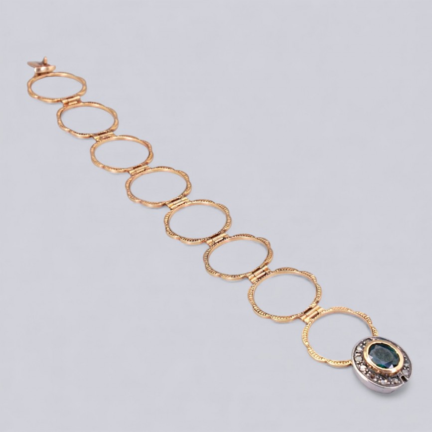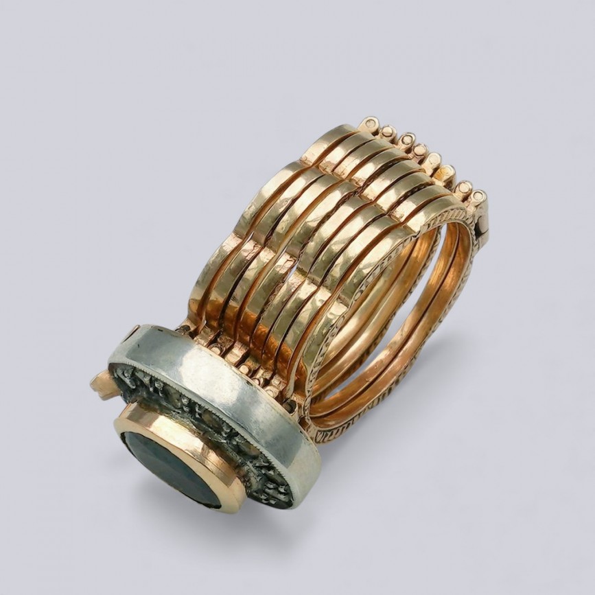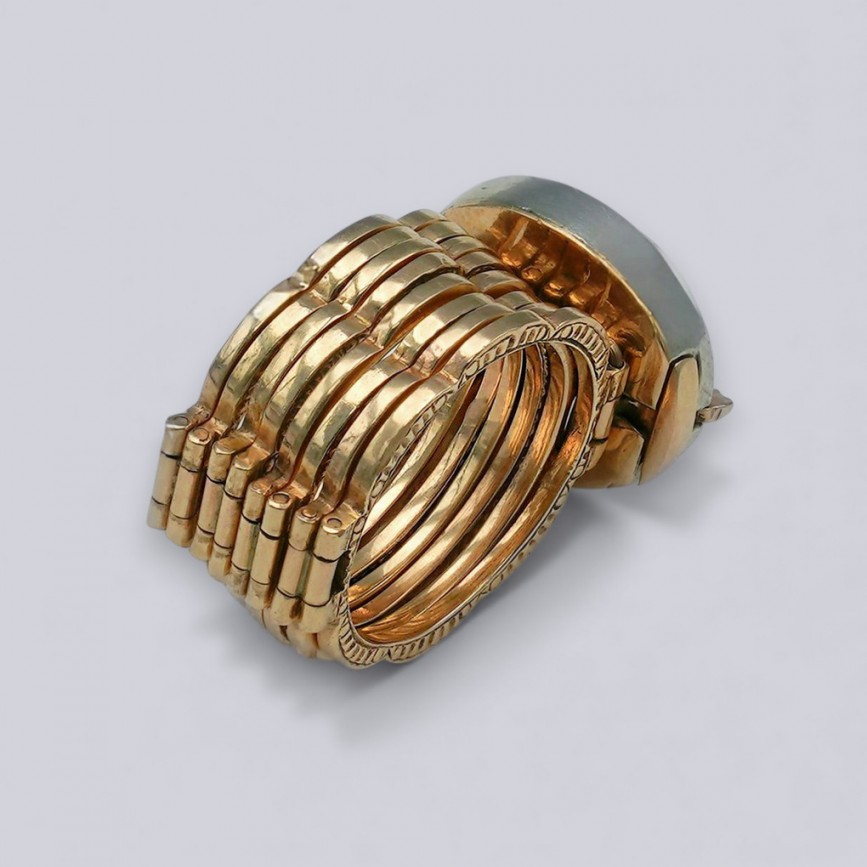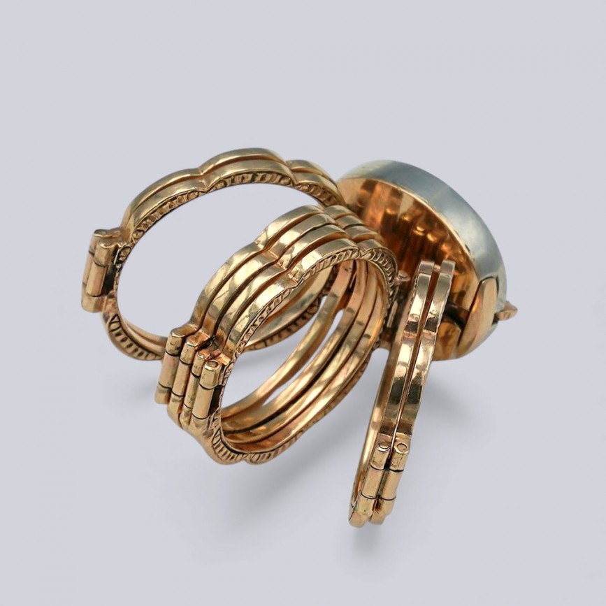 O piesă rară și spectaculoasă prin ingeniozitatea mecanismului, acest inel-brățară constituie un exercițiu de virtuozitate tehnică și rafinament decorativ,