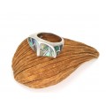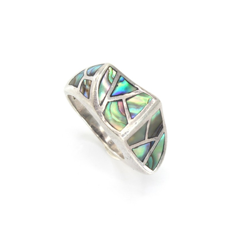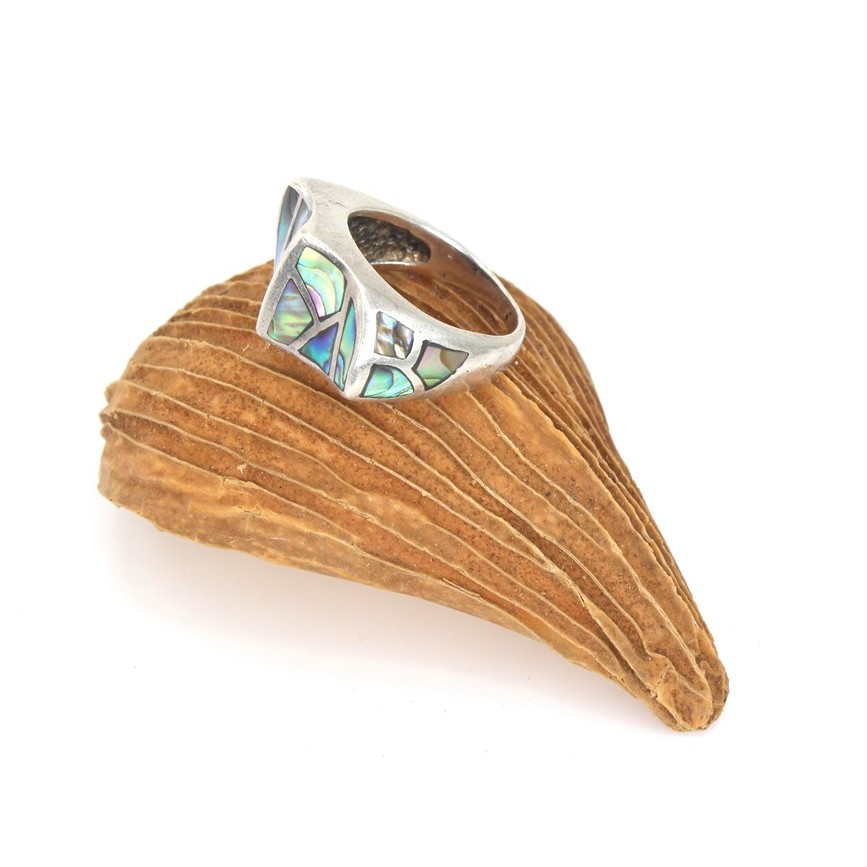 montură robustă în argint, turnat presat și cizelat; anturaje de sidef de scoică abalone